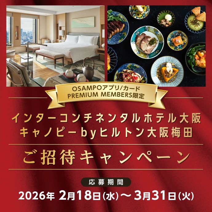 OSAMPOアプリ/カード プレミアムメンバーズ限定で、期間中にご応募いただいた方の中から、抽選でインターコンチネンタルホテル大阪 ペア宿泊券 または、キャノピーbyヒルトン大阪梅田 ペアランチ券をプレゼントいたします!