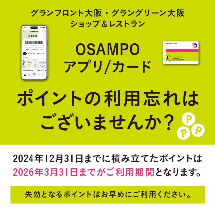 OSAMPOアプリ/カードにおいて、2024年12月31日までに積み立てたポイントは2026年3月31日までがご利用期間となります。 ご利用期間を過ぎたポイントは失効し、ご利用いただけなくなりますのでご注意ください。