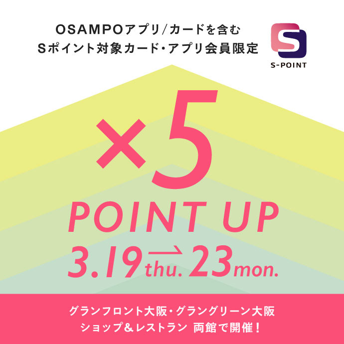 OSAMPOアプリ/カードほか、Sポイント対象カード・アプリをご提示いただくと、110円(税込)ごとに通常1ポイントのところ5ポイント進呈!