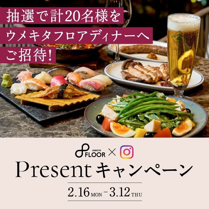 ウメキタフロア公式Instagram(@umekitafloor)にフォロー&コメントいただいた方の中から抽選で20名様に、ウメキタフロアで使えるディナーお食事券5,000円分をプレゼント!