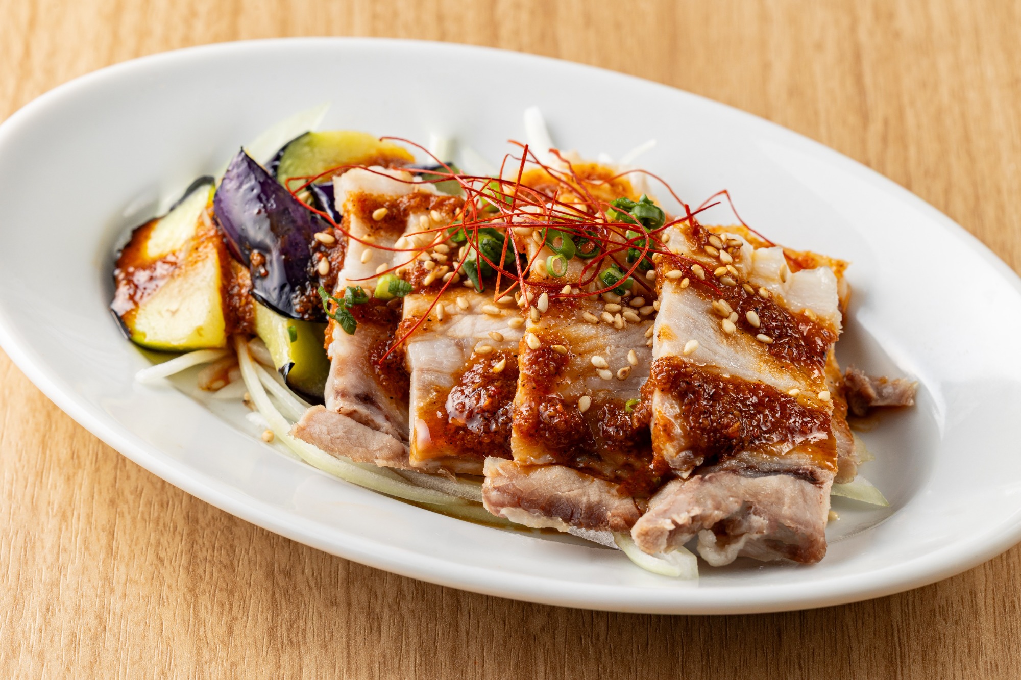 清らかな水と空気の中で大切に育まれた「火の本豚」は、熊本県が誇る逸品。この上質な豚バラ肉に、旨味をたっぷりと吸い込んだなすを組み合わせ、特製の旨辛香味ソースにて仕上げました。一口食べれば、ジューシーな豚バラとなすのハーモニー、そして旨味と辛さが織りなす至福の瞬間が、あなたを包み込みます。
