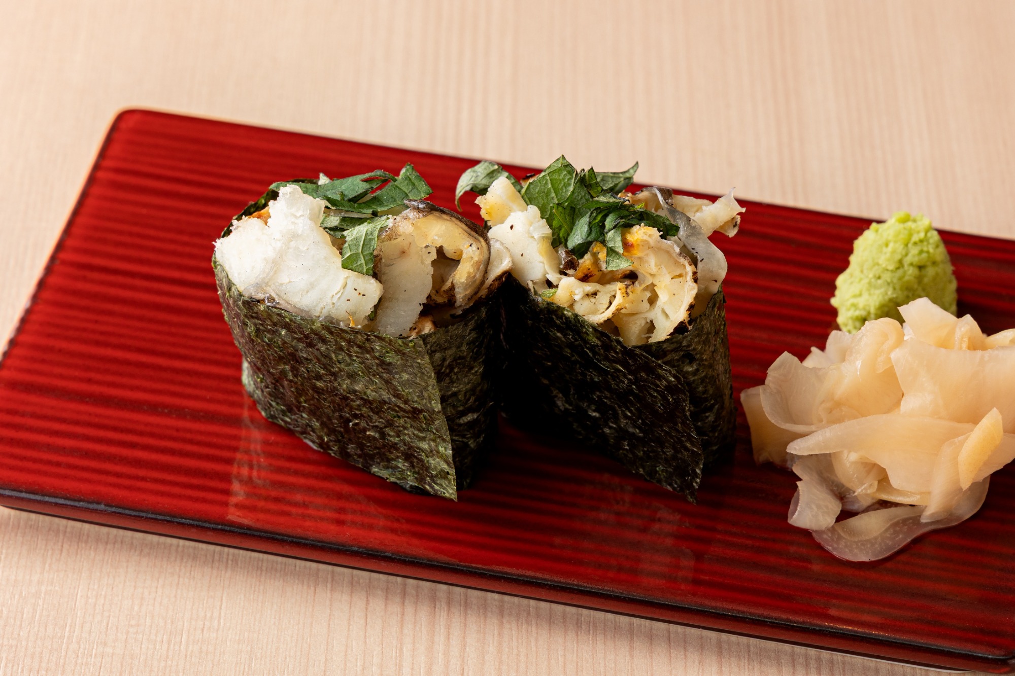 熊本県が誇る極上のはもを、匠の技で丹念に炙り上げました。香ばしさと奥深い旨味が際立つこの逸品は、伝統と革新が融合した至高の軍艦寿司。豊かなはもの香りとシャリの酸味が見事に調和し、食通をも唸らせる深い味わいをご堪能いただけます。