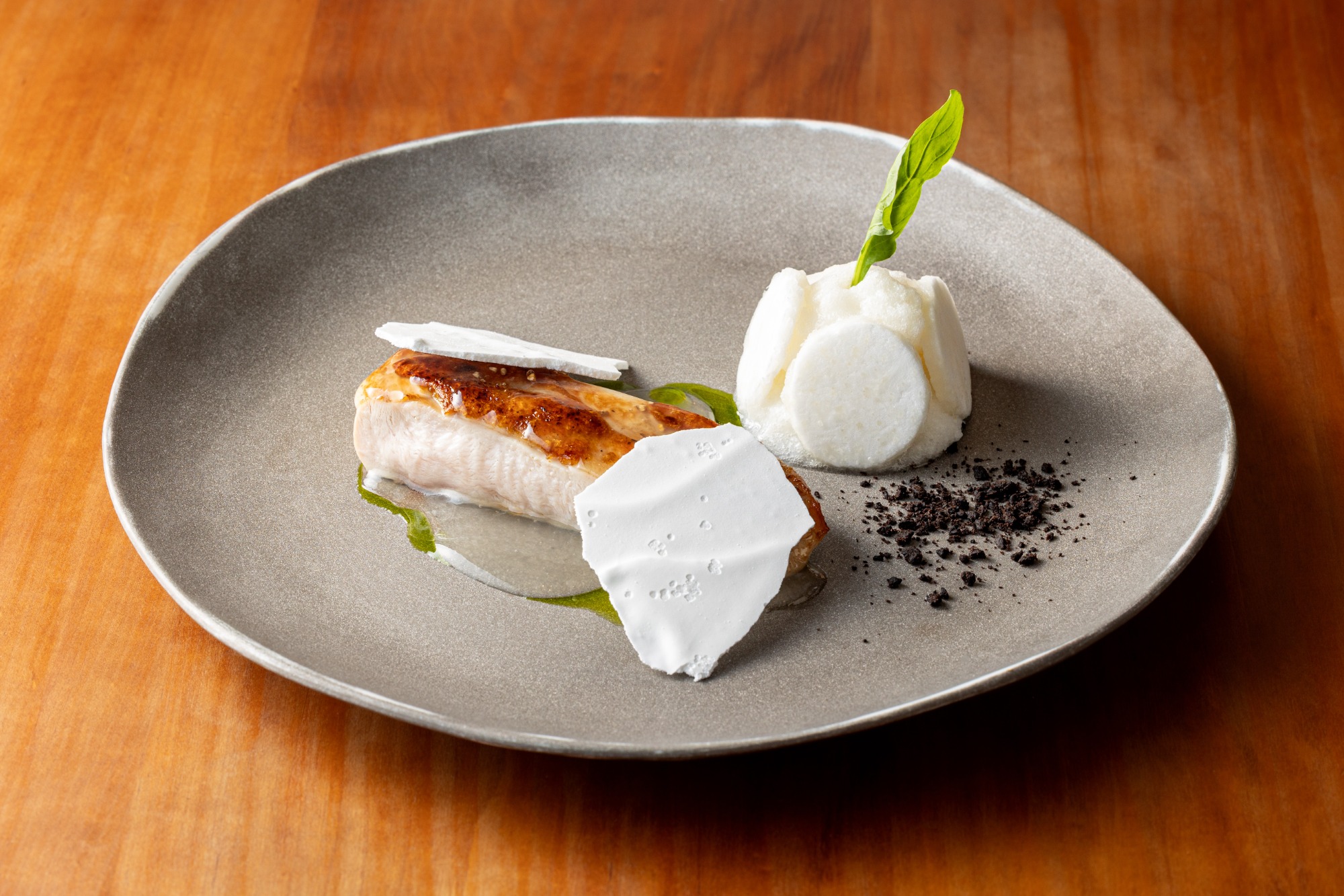 厳選された飼料と豊かな自然の中で育った鶏肉の王様「天草大王」。その上質なムネ肉を、独自の低温調理法でじっくりと時間をかけ、丁寧に仕上げました。これにより、驚くほどしっとりとした食感と、噛むたびに溢れ出す芳醇な肉汁を実現。秋の恵みである滋味深いカブを添え、心ゆくまでご堪能いただける口福な一皿をご提供いたします。(※コースではメインディッシュでのご提供となります。)