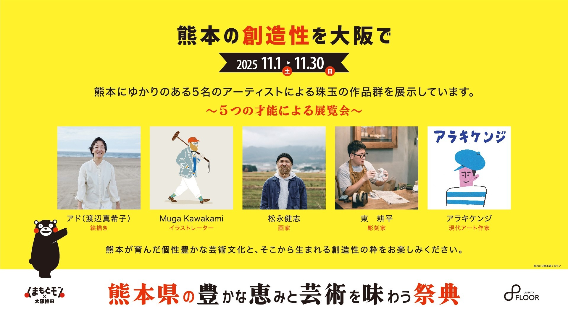 熊本県と大阪梅田の8施設にてコラボイベントを実施。熊本県にゆかりのあるアーティストの展覧会や限定メニューをお楽しみください。