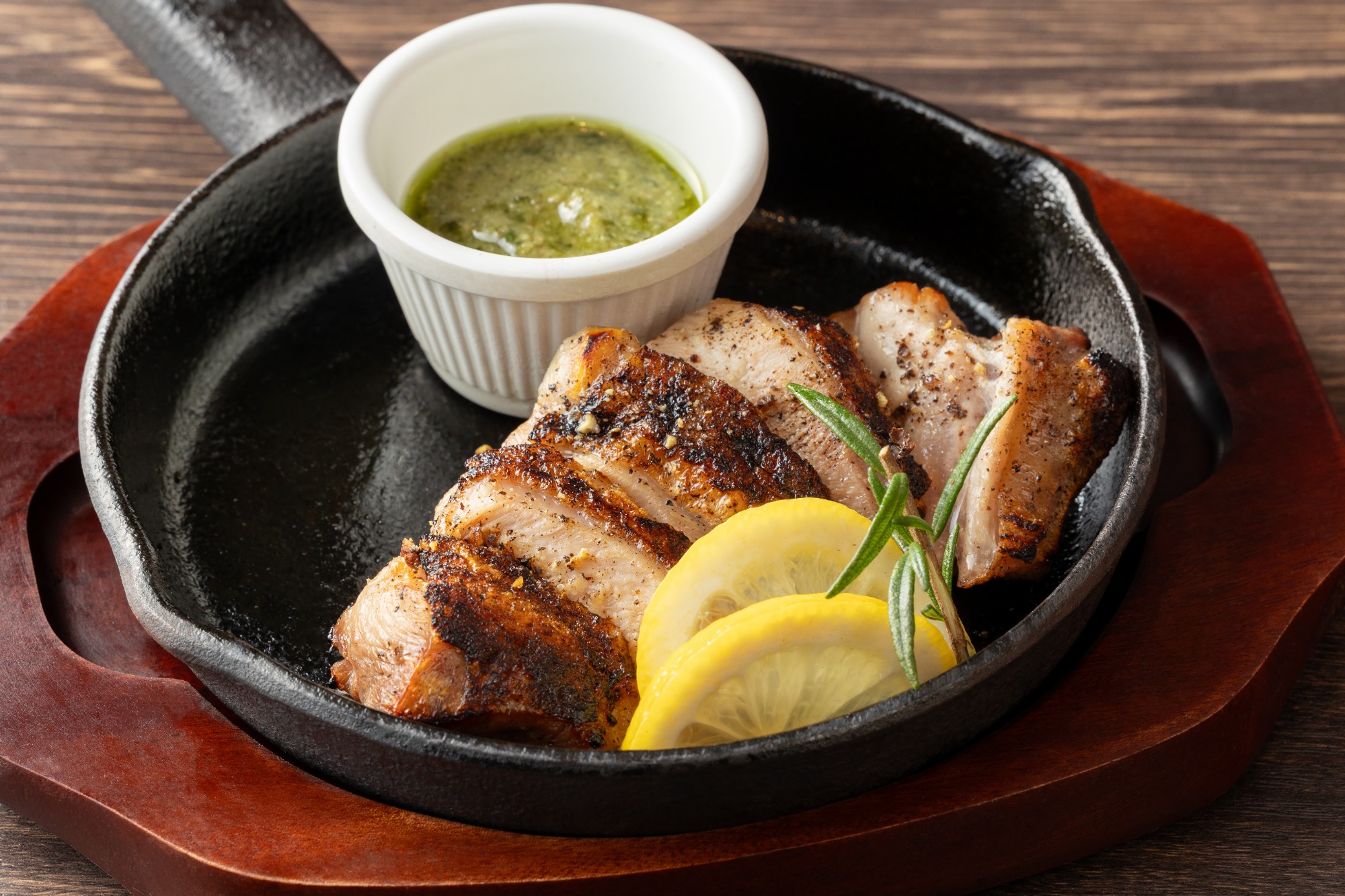 熊本県天草地方で特別な飼育方法で育まれた「天草大王」は、極上の味わいが特徴の地鶏です。特にモモ肉は、噛むほどに溢れる肉汁と豊かな旨味が凝縮された、ステーキに最適な部位です。この上質なモモ肉を自慢の石窯で焼き上げ、秘伝の自家製ソースで天草大王の魅力を最大限に引き出しました。