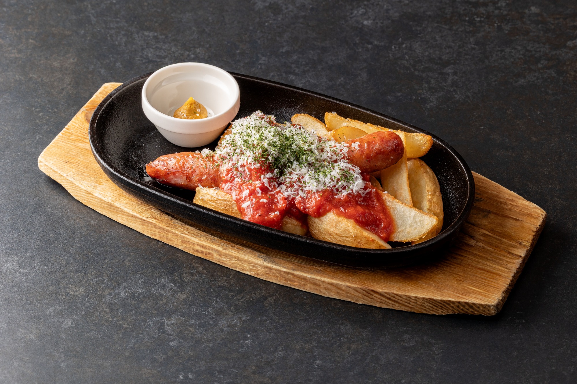 熊本県の豊かな自然が育んだブランド豚「火の本豚」を贅沢に使用した特製フランクフルト。熱々の鉄板で提供することで、旨みたっぷりの肉汁を閉じ込め、香ばしさを最大限に引き出します。とろりと濃厚な自家製トマトソースが、そのジューシーな味わいを一層際立たせ、まさに至福の口どけをお届けします。