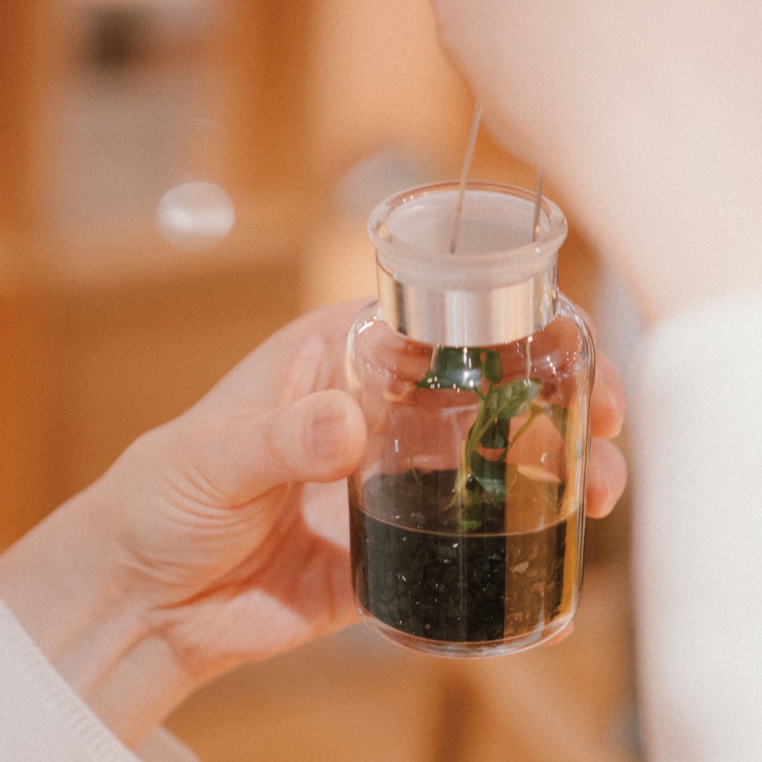 砂利、水草に少しの水、と最小限の要素で構成されたbottle をピンセット、スポイトを使って植え込んで頂きます。