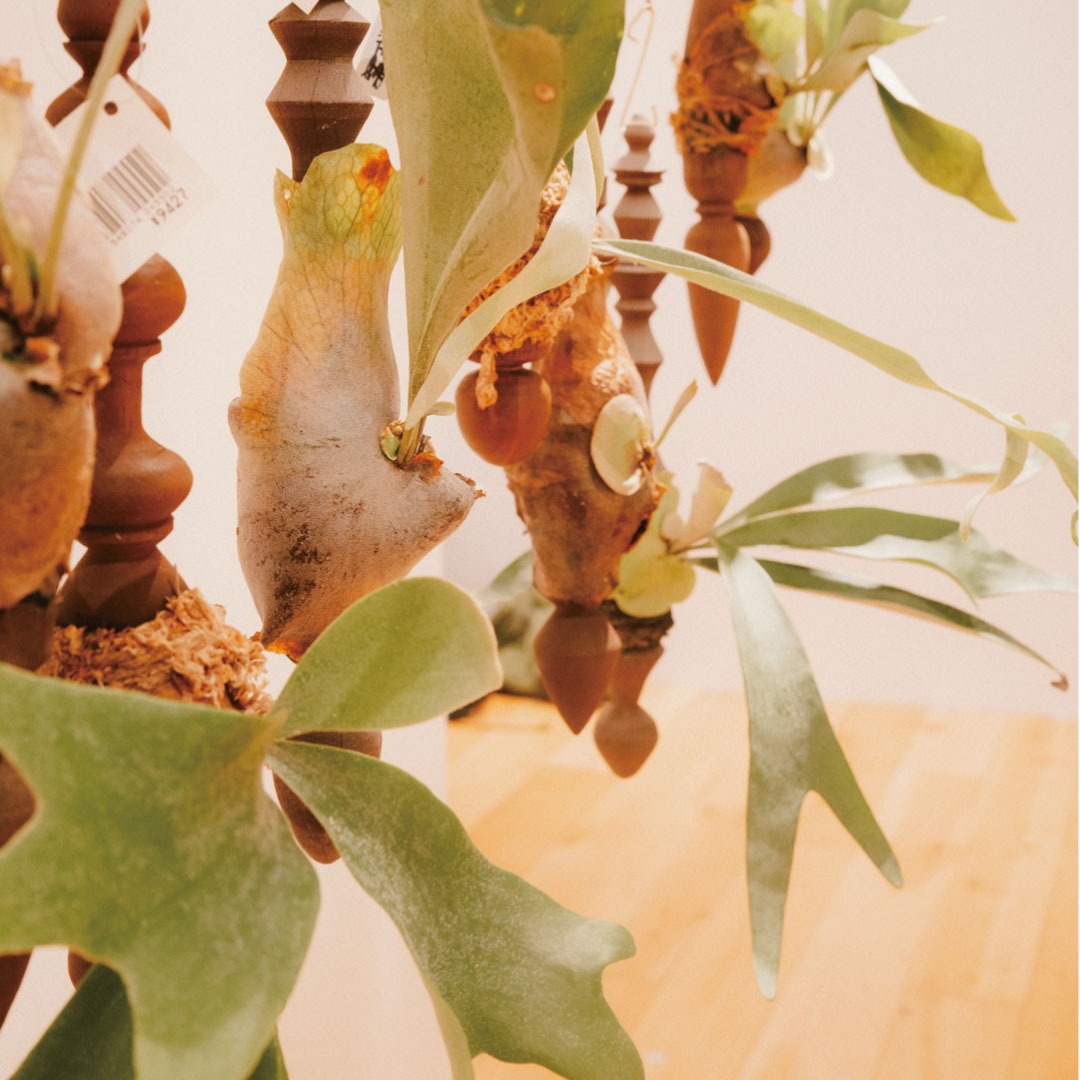 装飾的に削り出した木材にコウモリランを着生させる ワークショップです。