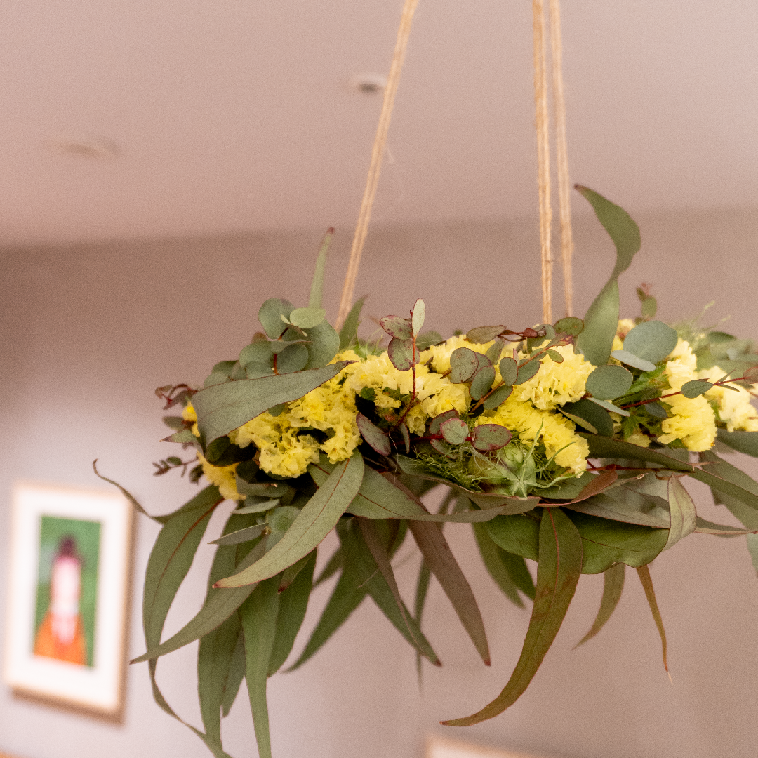 スターチス、ミモザ葉などの季節のお花でフライングリースを制作します。