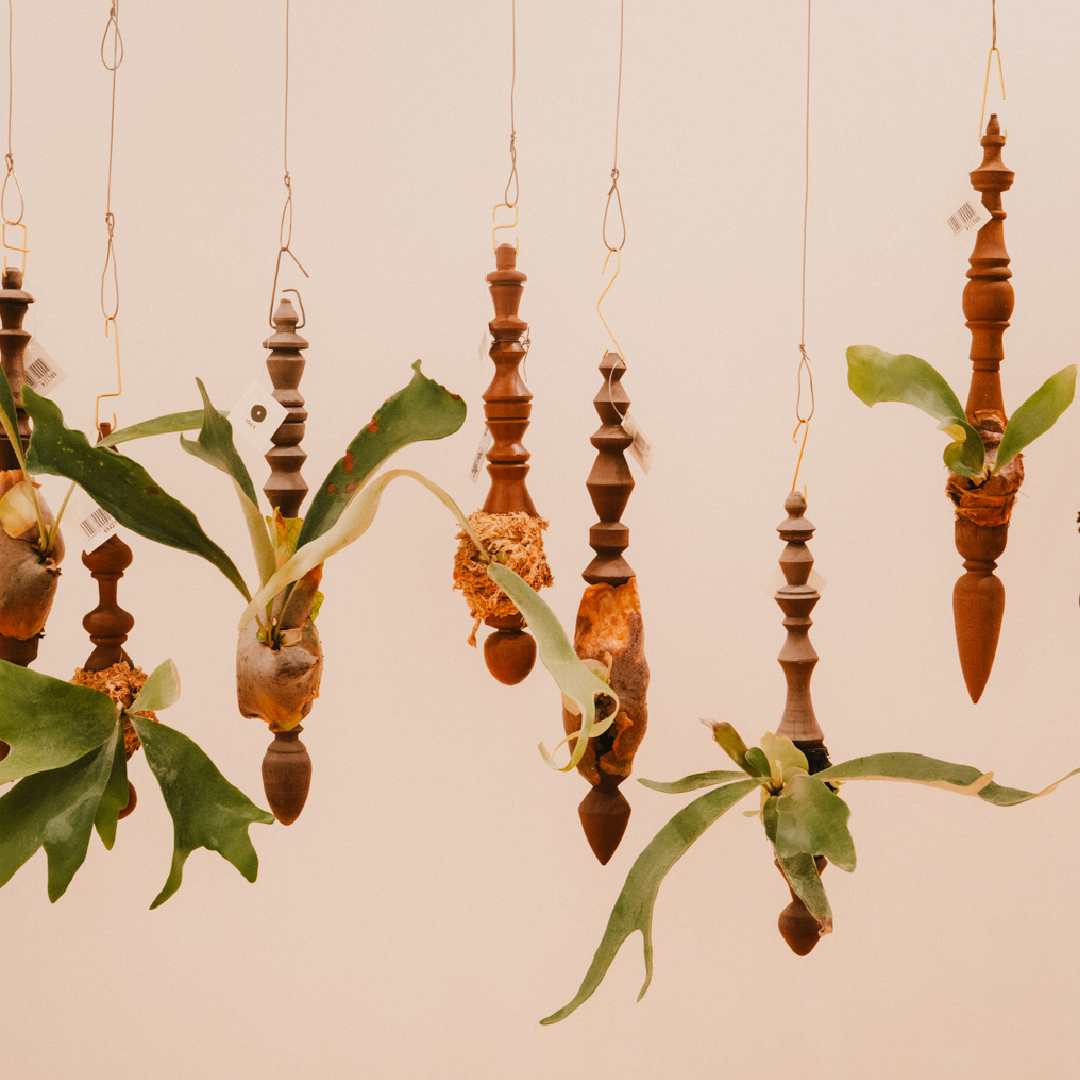 装飾的に削り出した木材にコウモリランを着生させるワークショップです。
