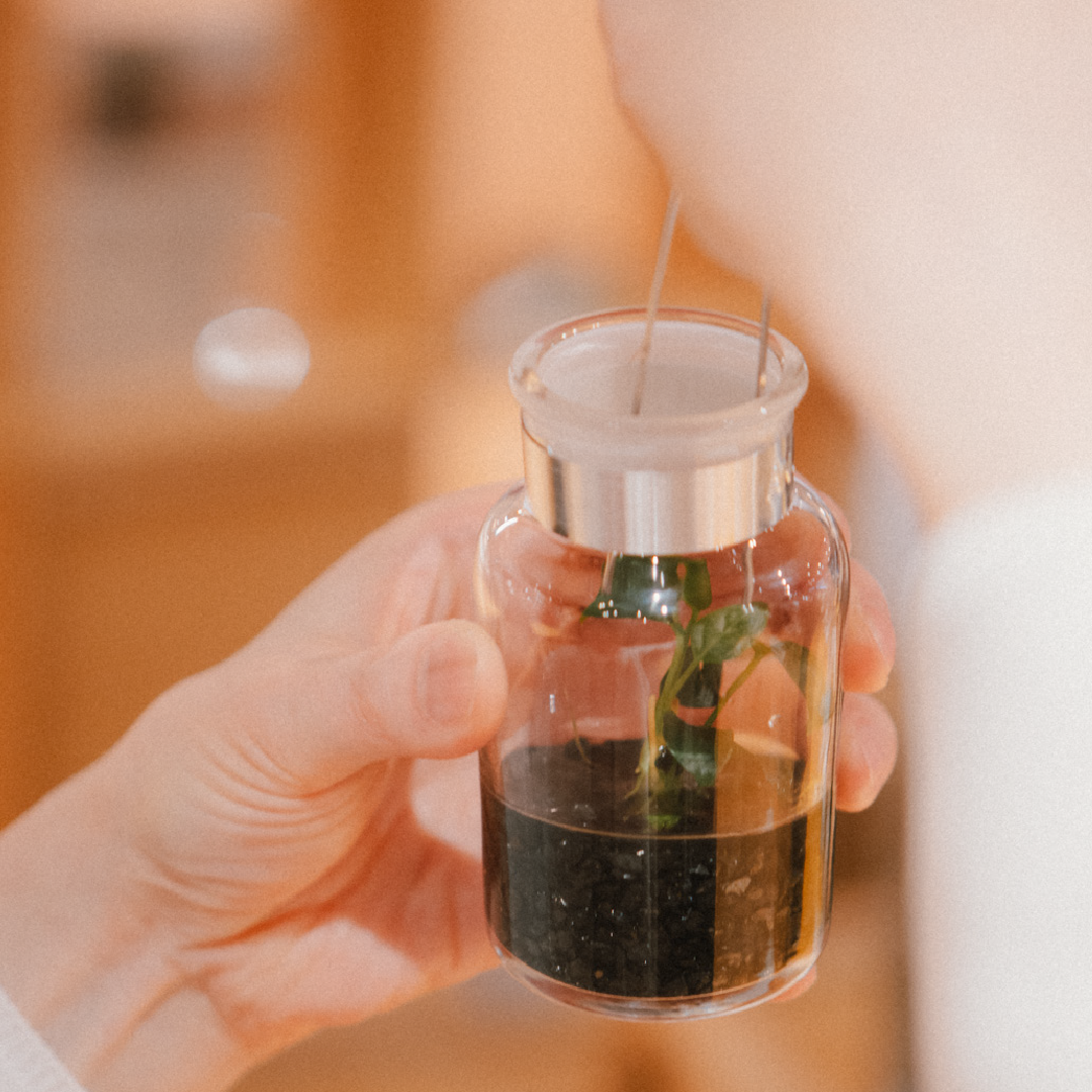 透明度の高い実験用ガラス瓶に水草を植え込むボトルバイボタニストワークショップを実施します。