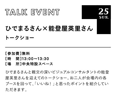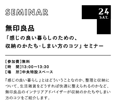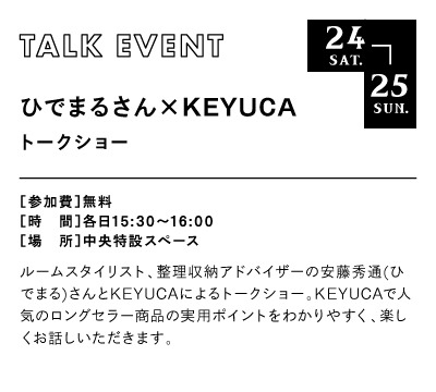 ほかにも、ルームスタイリストの安藤秀通さんやビジュアルコンサルタントの能登屋英里さんをお迎えしてのトークイベント、インテリアのプロによるセミナー、ワークショップなどお楽しみも満載です。