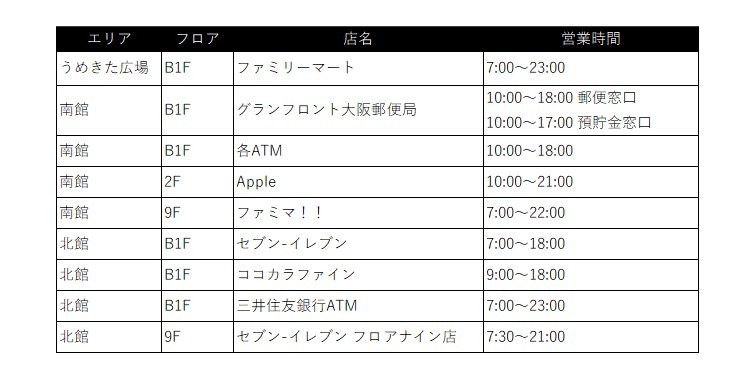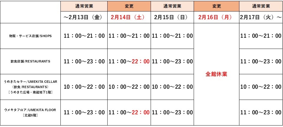 ※2月14日(土)・15日(日)については、法定点検のため、うめきた広場・南館・北館の一部飲食店舗で営業時間を変更いたします。
