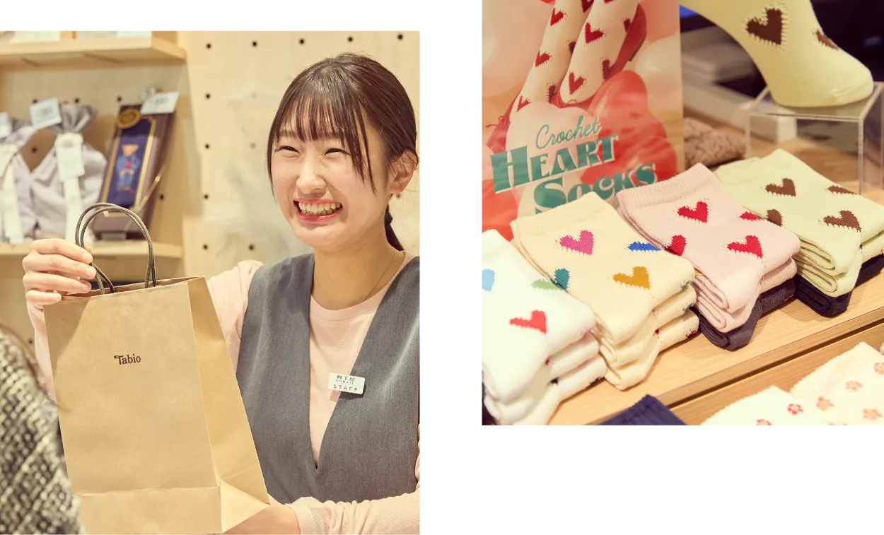 接客では無理に距離を縮めることはせず、お客様一人ひとりの様子に合わせた関わりを大切にしています。そうした中で、他店舗のスタッフさんが来てくださることも多く、お互いのお店をお客様に紹介し合ったり、隣の店舗のスタッフさんがお客様と一緒に靴下選びに来てくださったりと、店舗の垣根を超えたご縁を感じています。