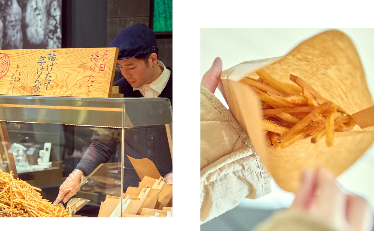 うめきた広場にある芋菓子専門店「芋屋金次郎」では、国産芋・砂糖・油のみでつくる昔ながらの芋けんぴを中心に、スイートポテトやソフトクリームなどの芋菓子を取り揃えています。その味を目当てに何度も足を運んでくださる方が多く、来店されるお客様の約半数が常連のお客様です。朝のオープン時間に合わせ、揚げたての芋けんぴを目当てにまとめ買いされる方もいらっしゃるほど。日常の中で繰り返し選んでいただけること、その一つひとつのご縁を大切に、変わらないおいしさを届けていきたいです。