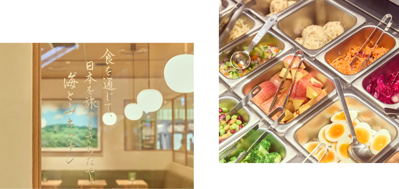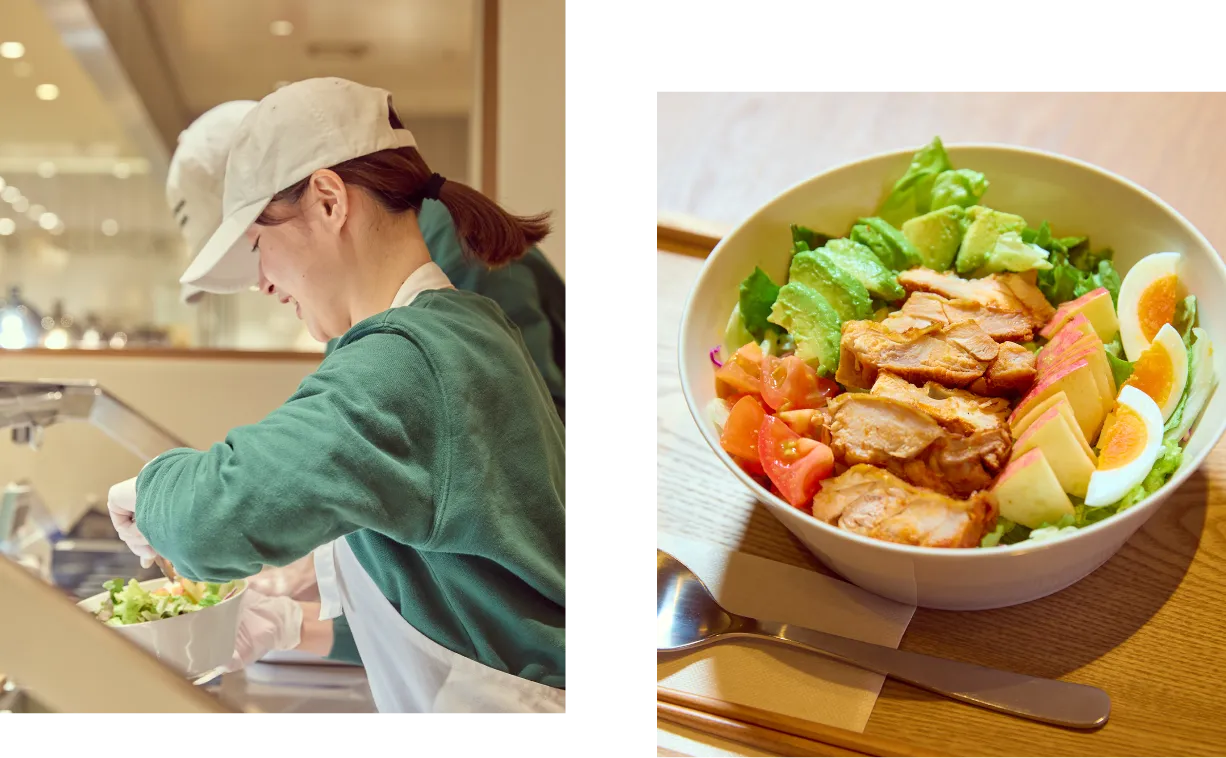 うめきた広場にあるサラダ専門店「Umi & Yama Kitchen」では、「肉・魚のメイン具材」に「たっぷりの野菜・玄米」などを合わせた、「一杯で満足できる、お弁当のようなサラダ」を提供しています。日頃から笑顔でお迎えすることを大切にし、お客様が自然と立ち寄りたくなる心地よいお店づくりを心がけています。