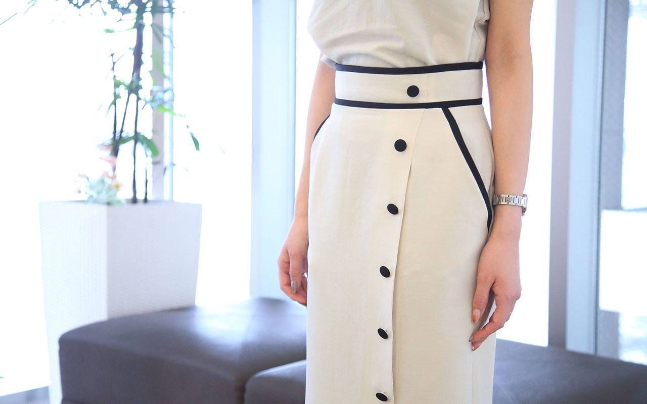 縦に配したくるみボタンがアクセントになったタイトスカートは、上品な印象を与えてくれる膝下丈。ウエストとポケットにあしらわれた黒のパイピングが引き締め役で、大人かわいいデザインにひと目惚れしました。生成りに近い明るいベージュの素材はリネン混なので爽やかな着心地です。
