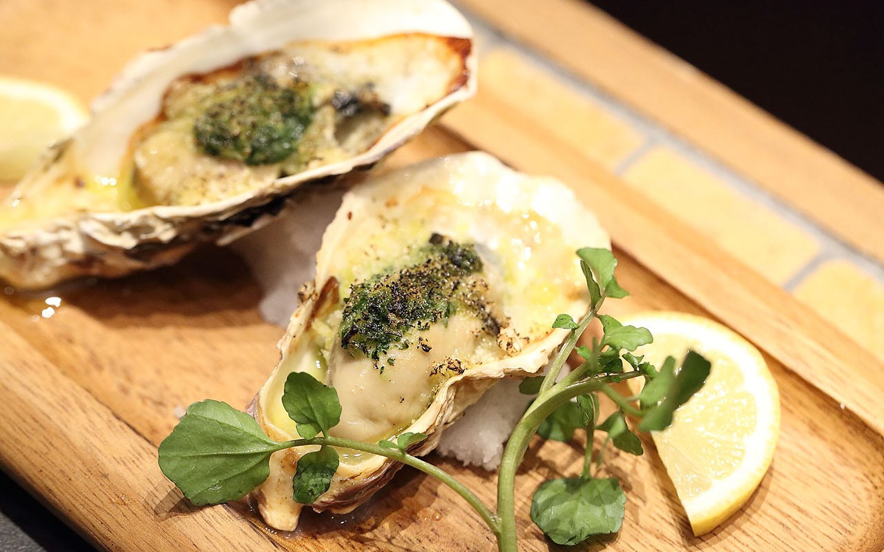 実はこちら、南館7Fの海鮮料理店、博多漁家 磯貝の姉妹店。「まとめて仕入れているから、魚介も野菜も新鮮で質が高いものを手頃な価格で提供できるんです」と、店長。なるほど、だから日替わりメニューが充実なんですね。これからのシーズンは牡蠣がおすすめだそう。ガーリックバターやチーズ焼きなど好きな食べ方を選べます。牡蠣の香草ガーリックバター(2ピース)520円