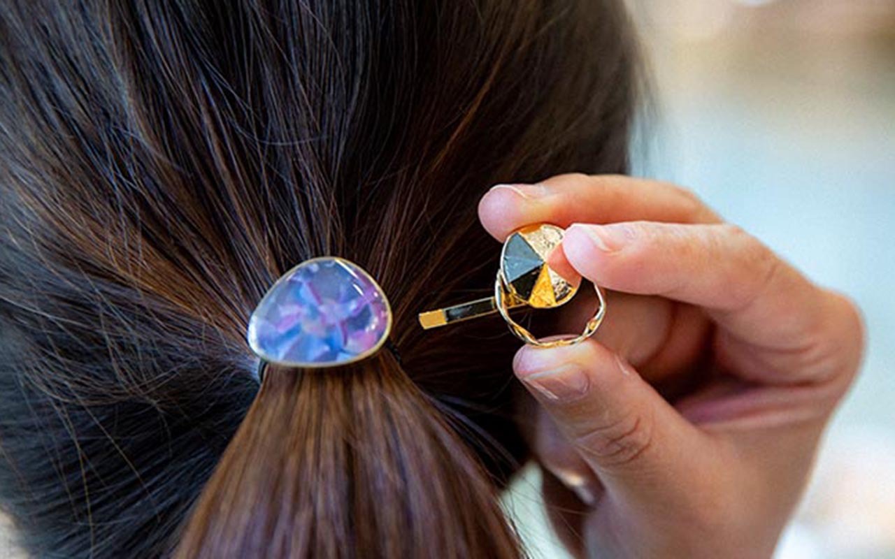 気になったのがこのマジェステ。カーブ状のカバーを、まとめた髪にかぶせてかんざしのような棒状のスティックで留めるもの。