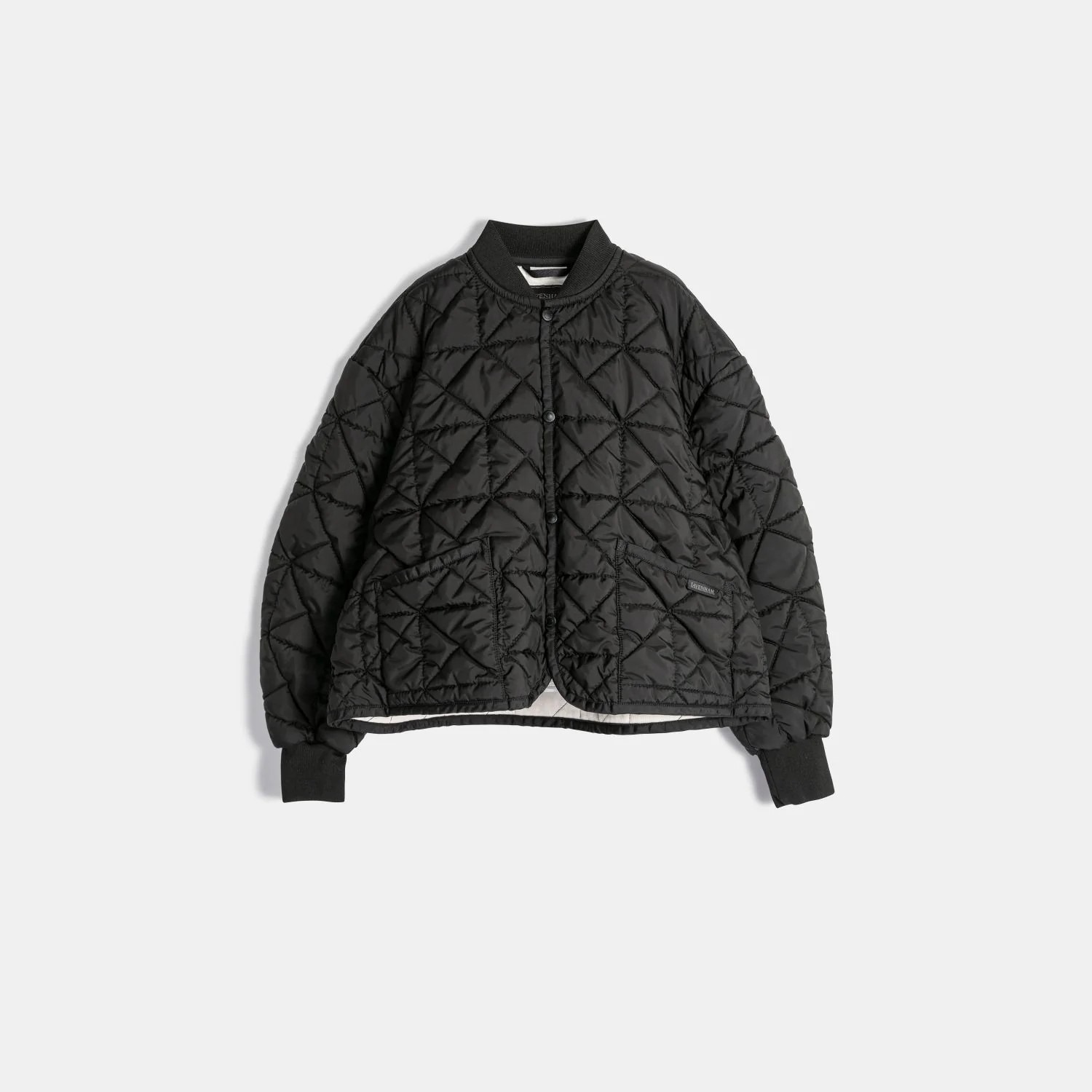 キルティングには、幾何学的な「クラッシュド・スクエア」パターンを採用。