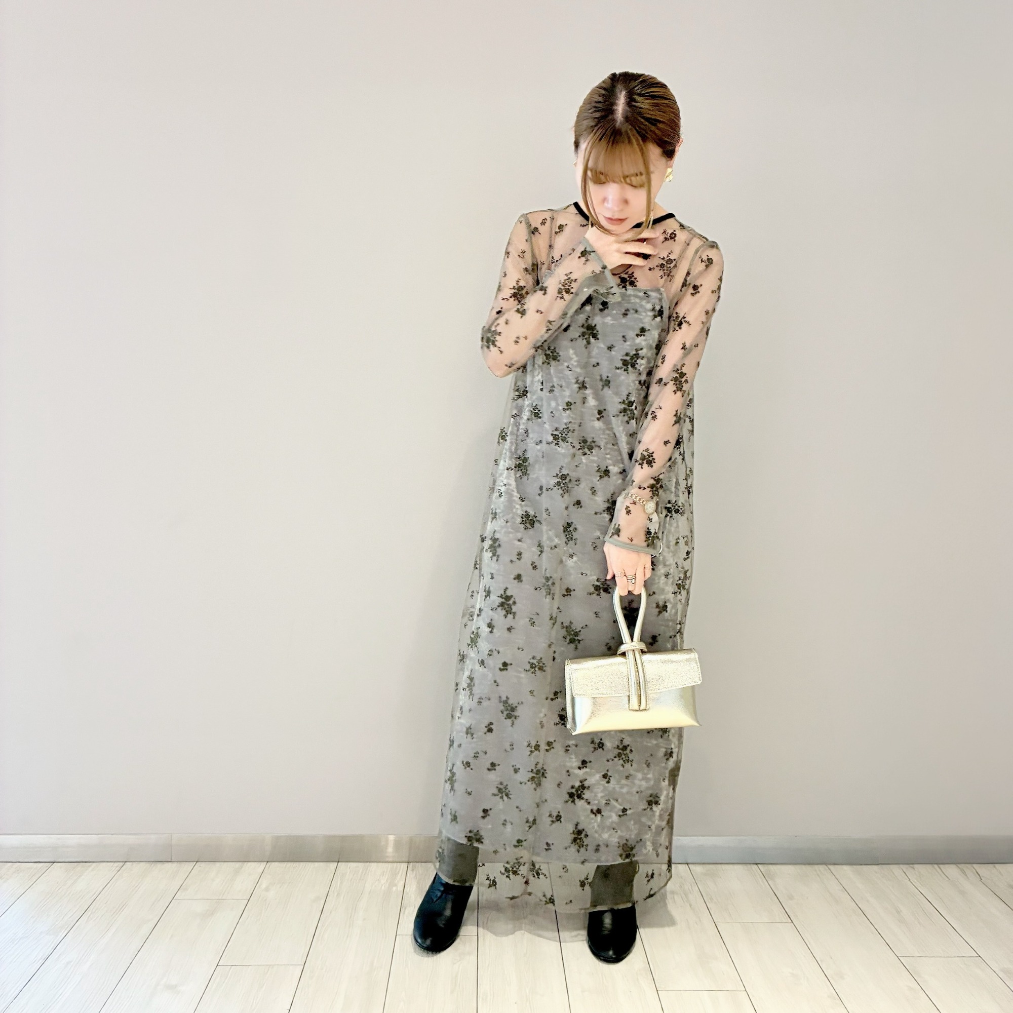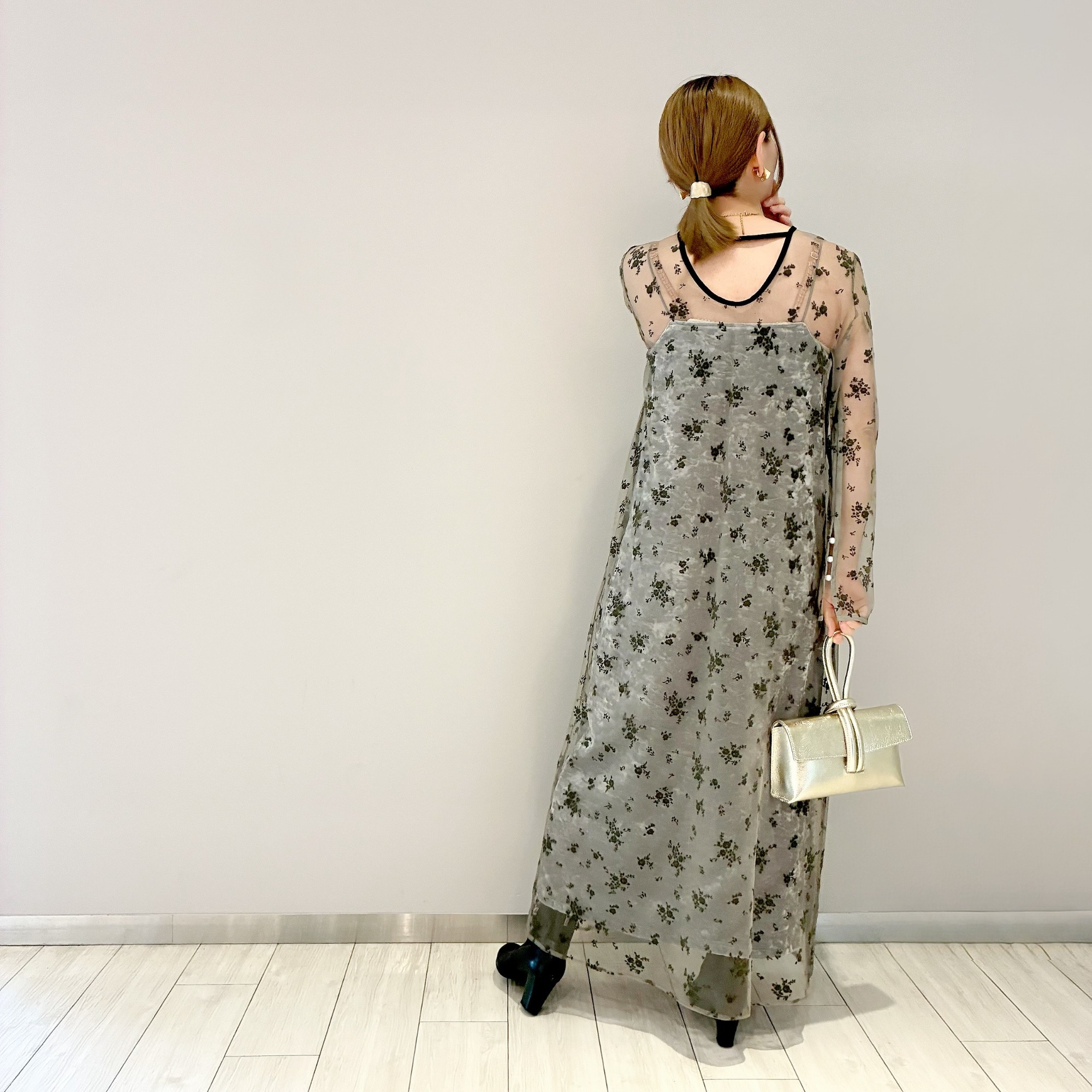 フラワーパターンが施されたフロッキー加工のチュールドレスと、柔らかなベロア素材のキャミソールドレスのセットアイテム。