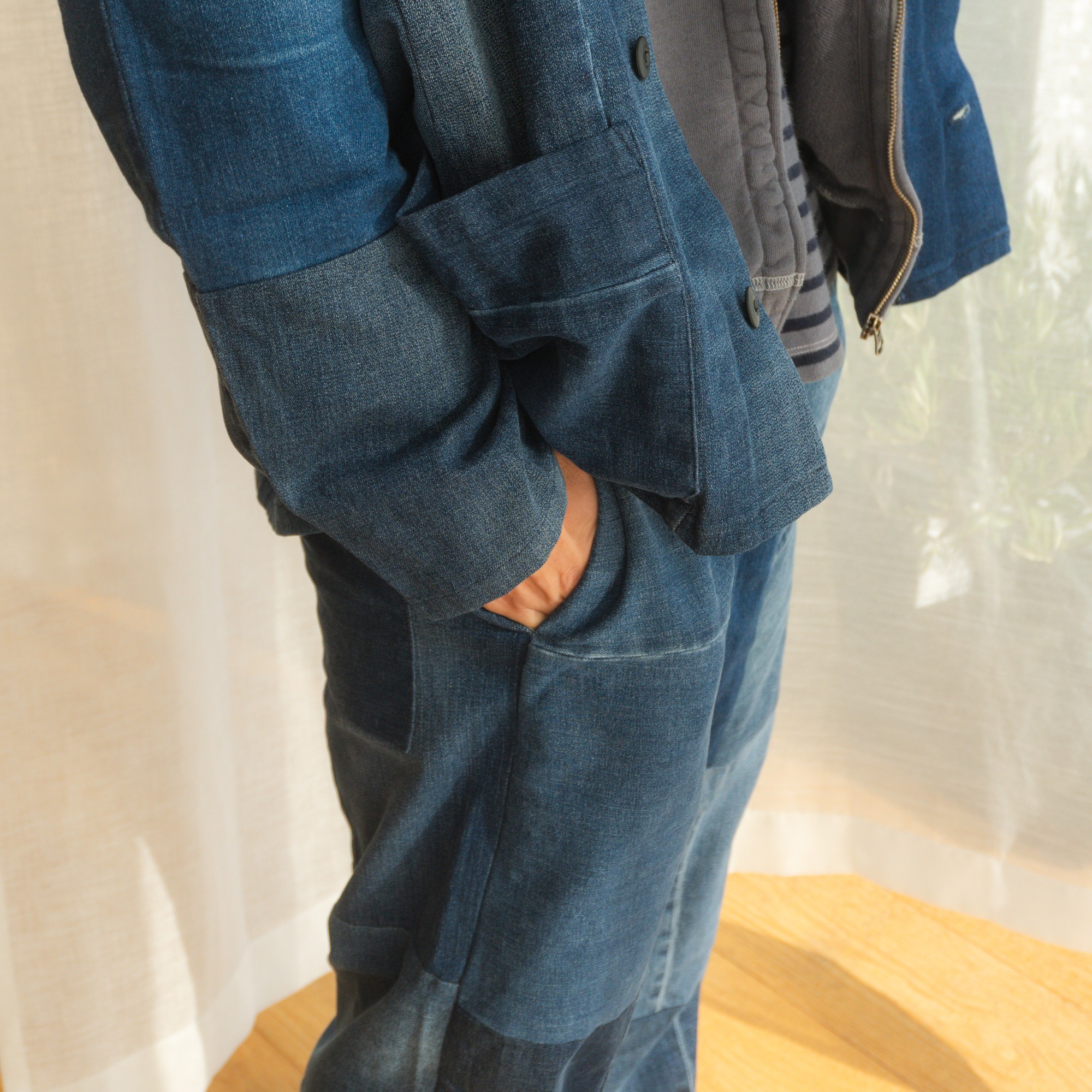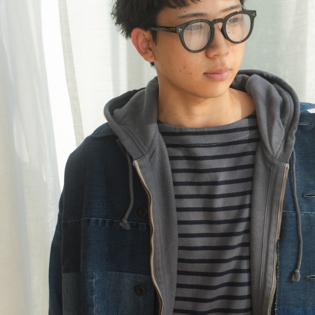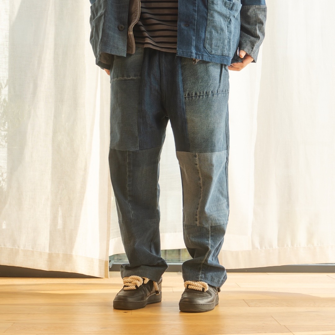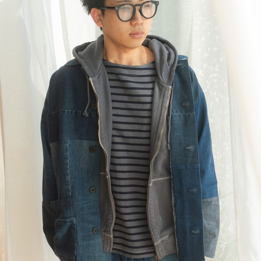 あえて同系色で合わせることで、デニムの風合い、つなぎめの美しさを楽しめるようにコーディネートしました。