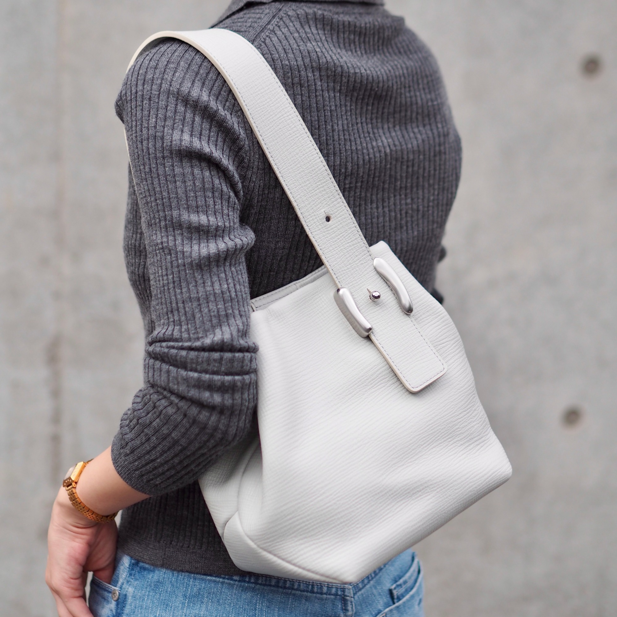 ブラックはシルバーのメタルバックルが際立ちシックなイメージに。ライトグレーは秋冬のダークカラーコートとの相性抜群*