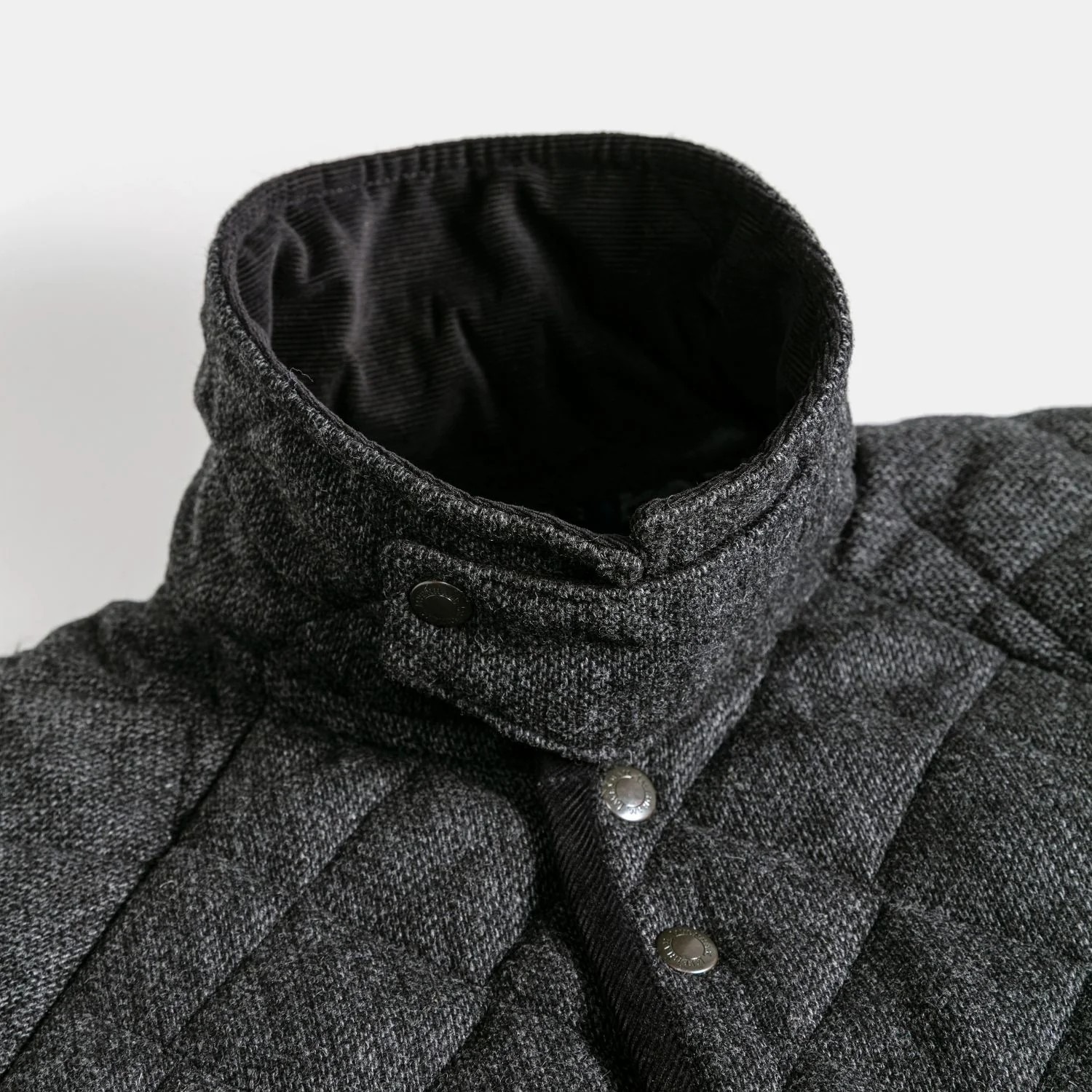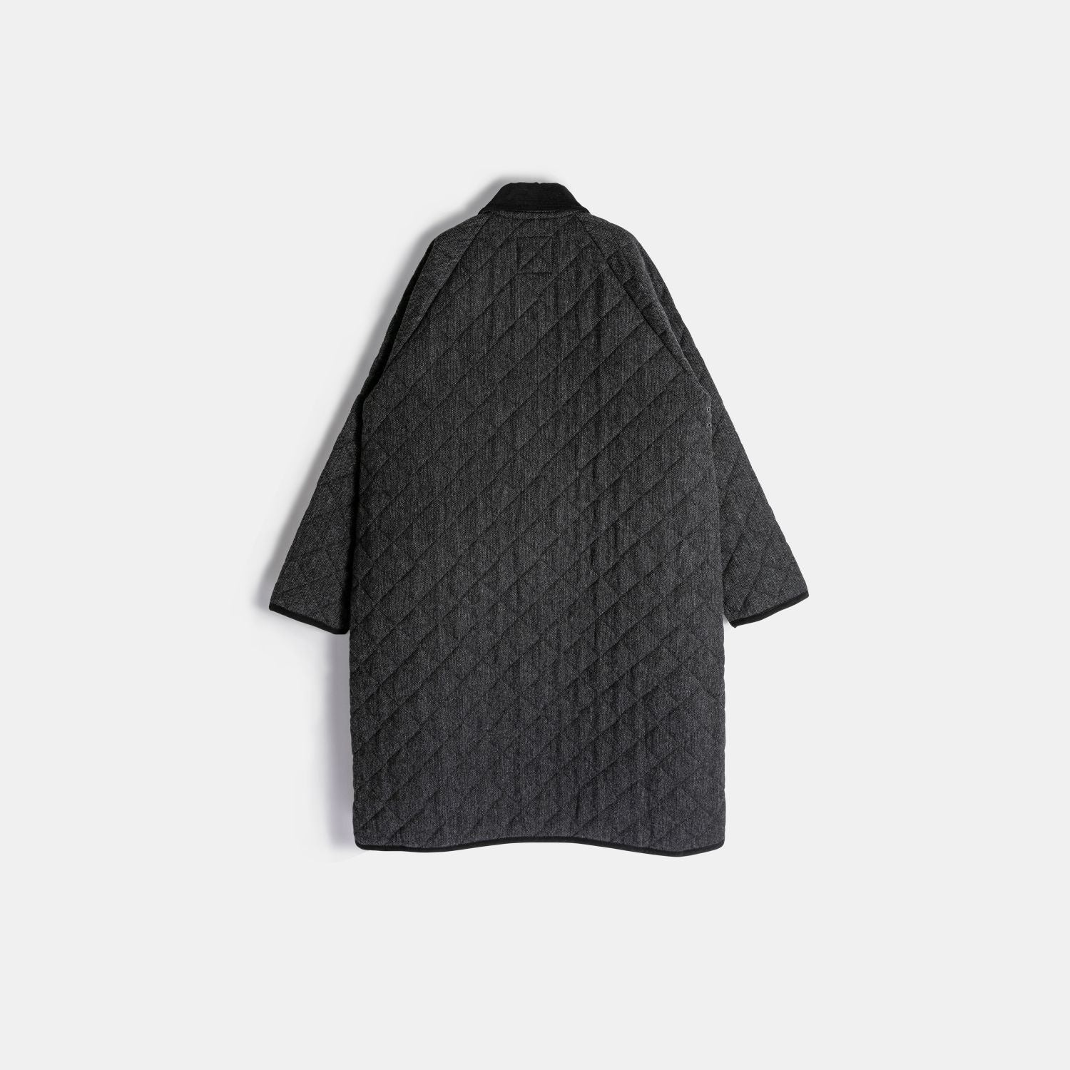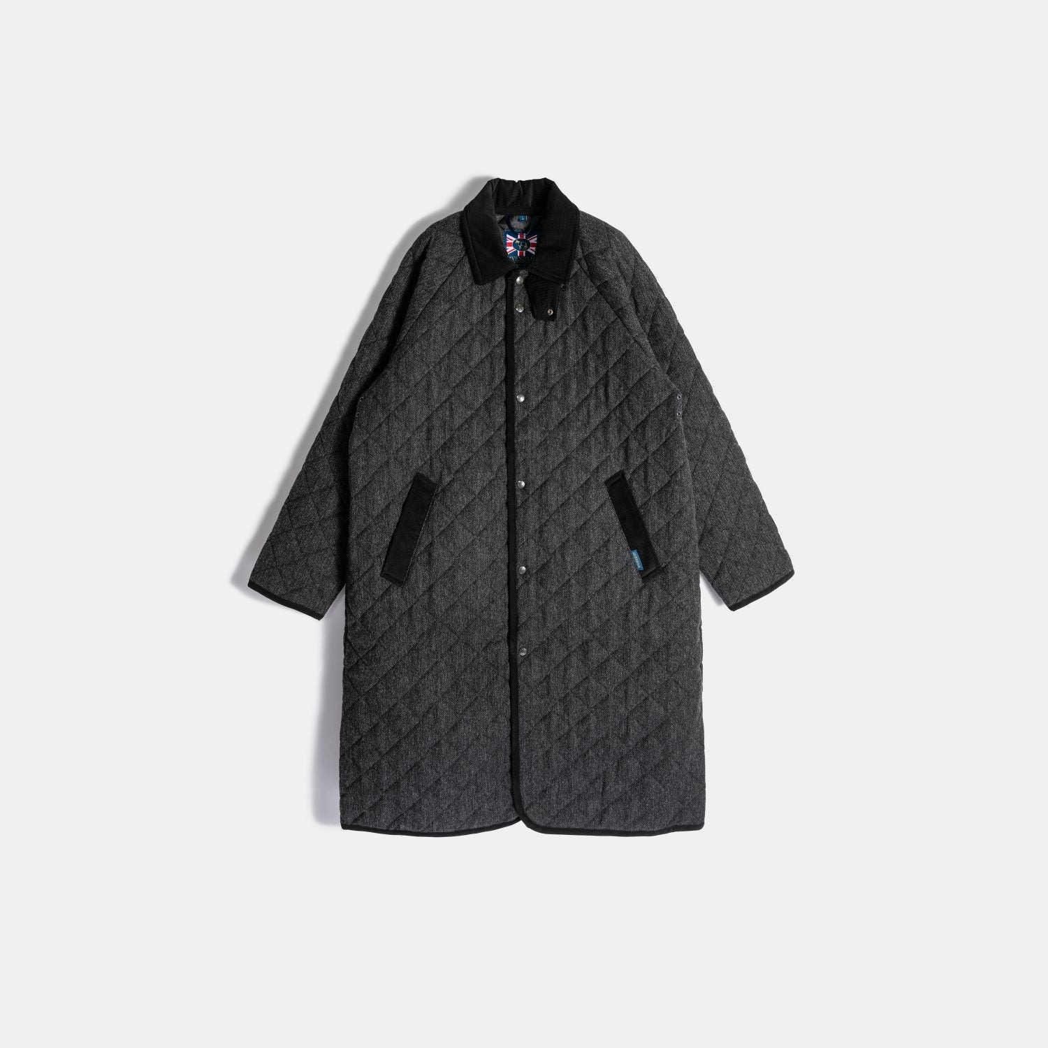 クラシックな2インチダイヤモンドパターンでキルティングされた、洗練されたシルエットのロングコート