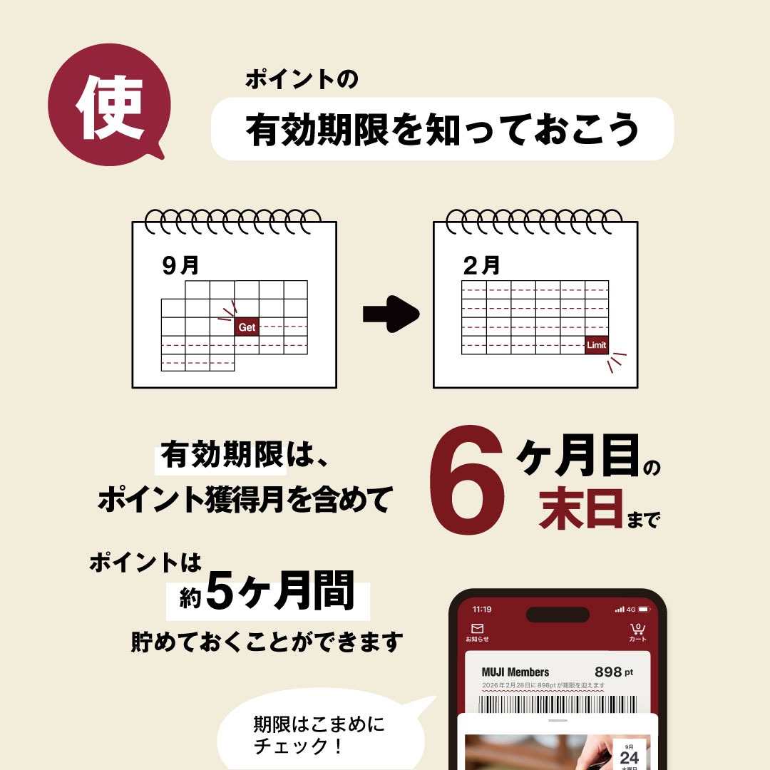 MUJIショッピングポイントは、店舗でもネットストアでも1ポイント=1円としてお買い物の際にご利用いただけます。