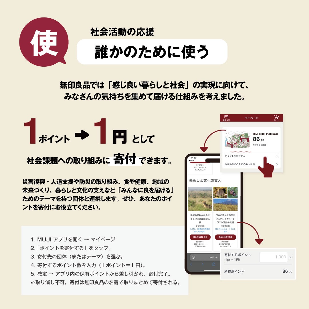さらに、MUJIアプリでは、ポイントをお買い物だけでなく寄付として活用することができます。