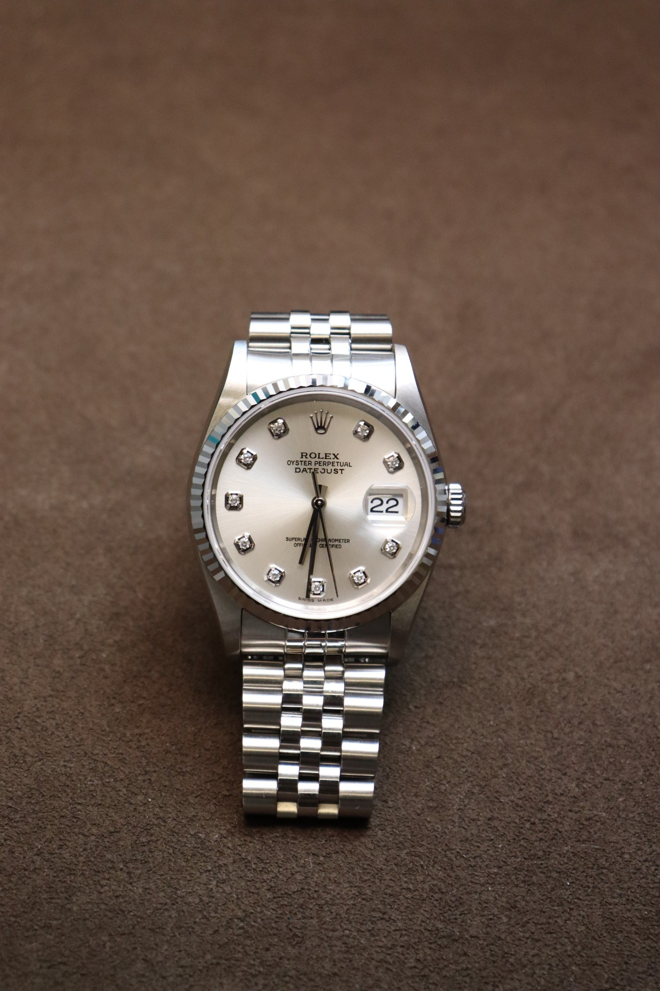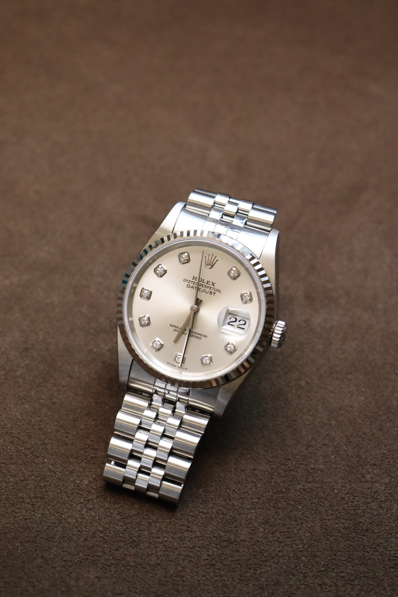 美しいカッティングが施されたフルーテッドベゼルが特徴の人気定番モデル。K18ホワイトゴールドとステンレス製のケースに10ポイントダイヤモンドインデックスのラグジュアリーな一品です。当店オーバーホール済み。