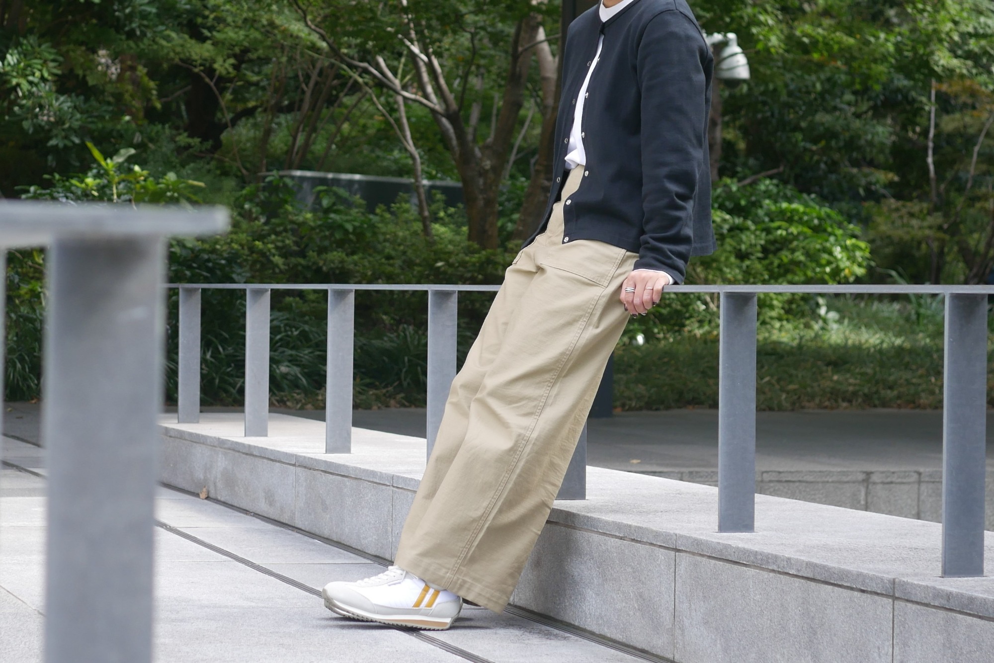 シンプルなコーディネートに、2ラインやステッチの遊び心がポイントになります。