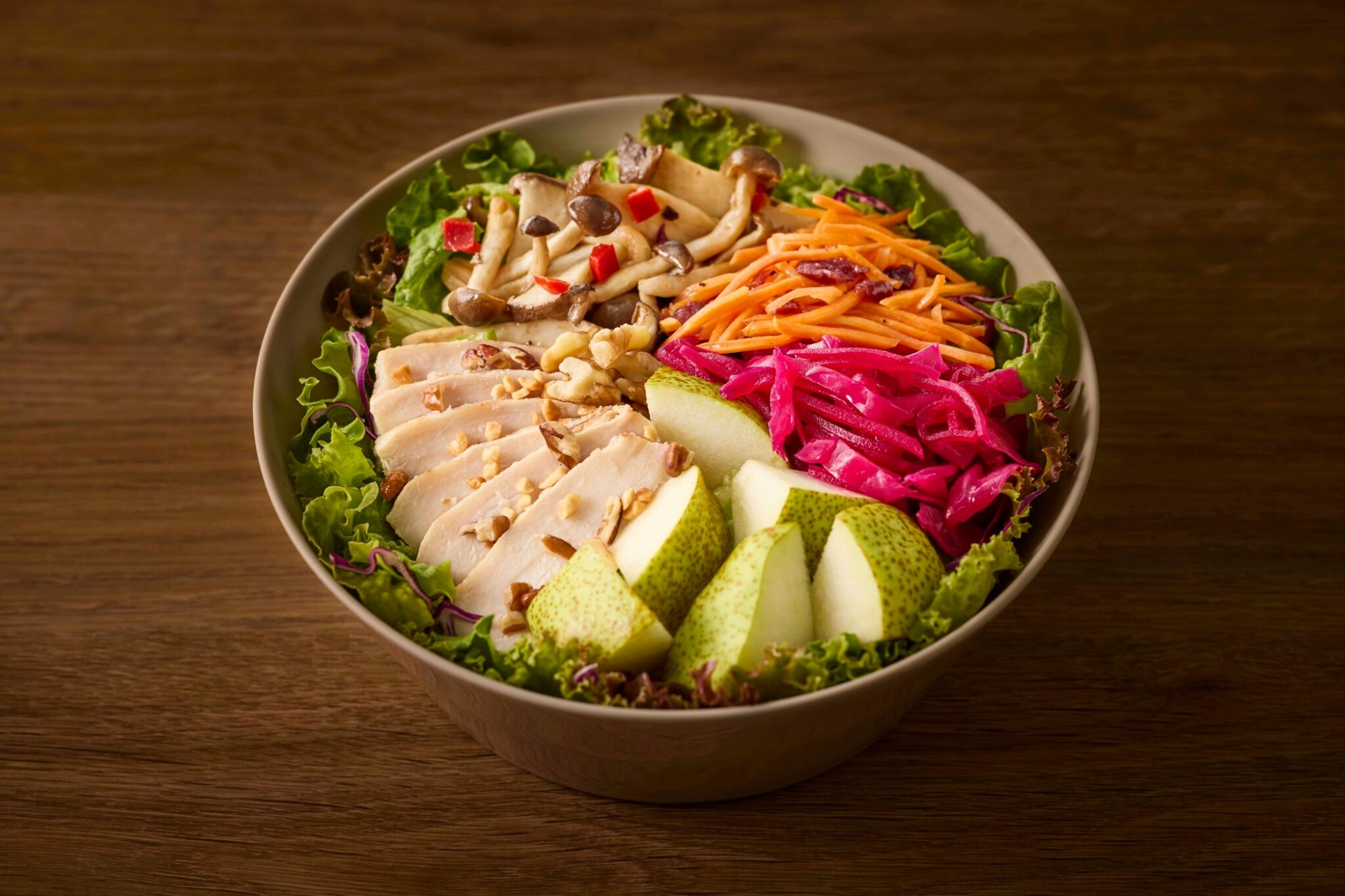 今が旬!山形県産のラ・フランスと、つや姫塩糀チキンが主役。濃厚なヨーグルト×コクのあるチーズのドレッシングを合わせました。