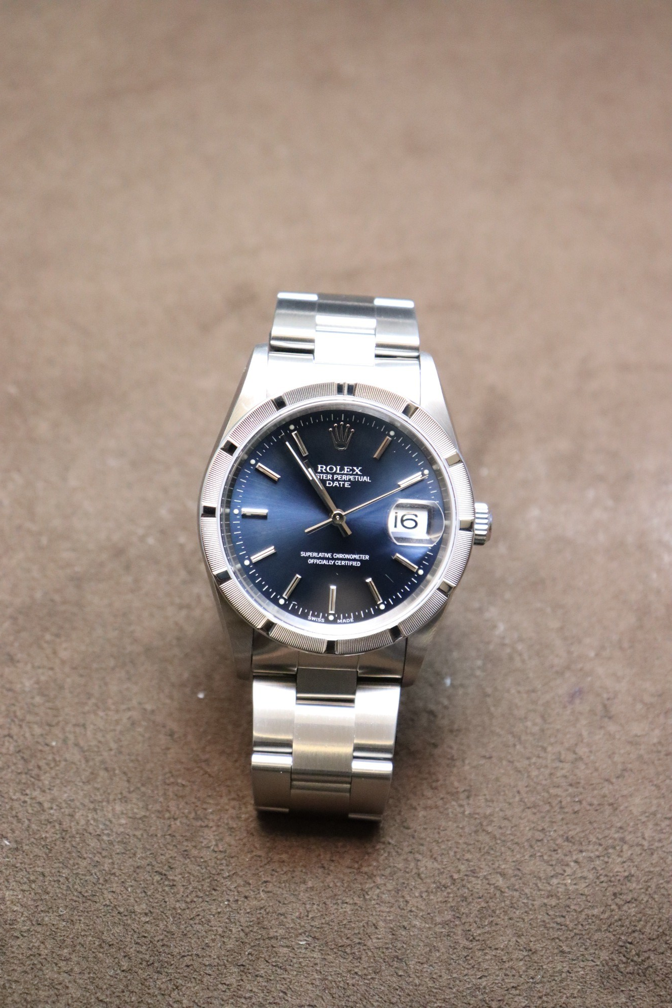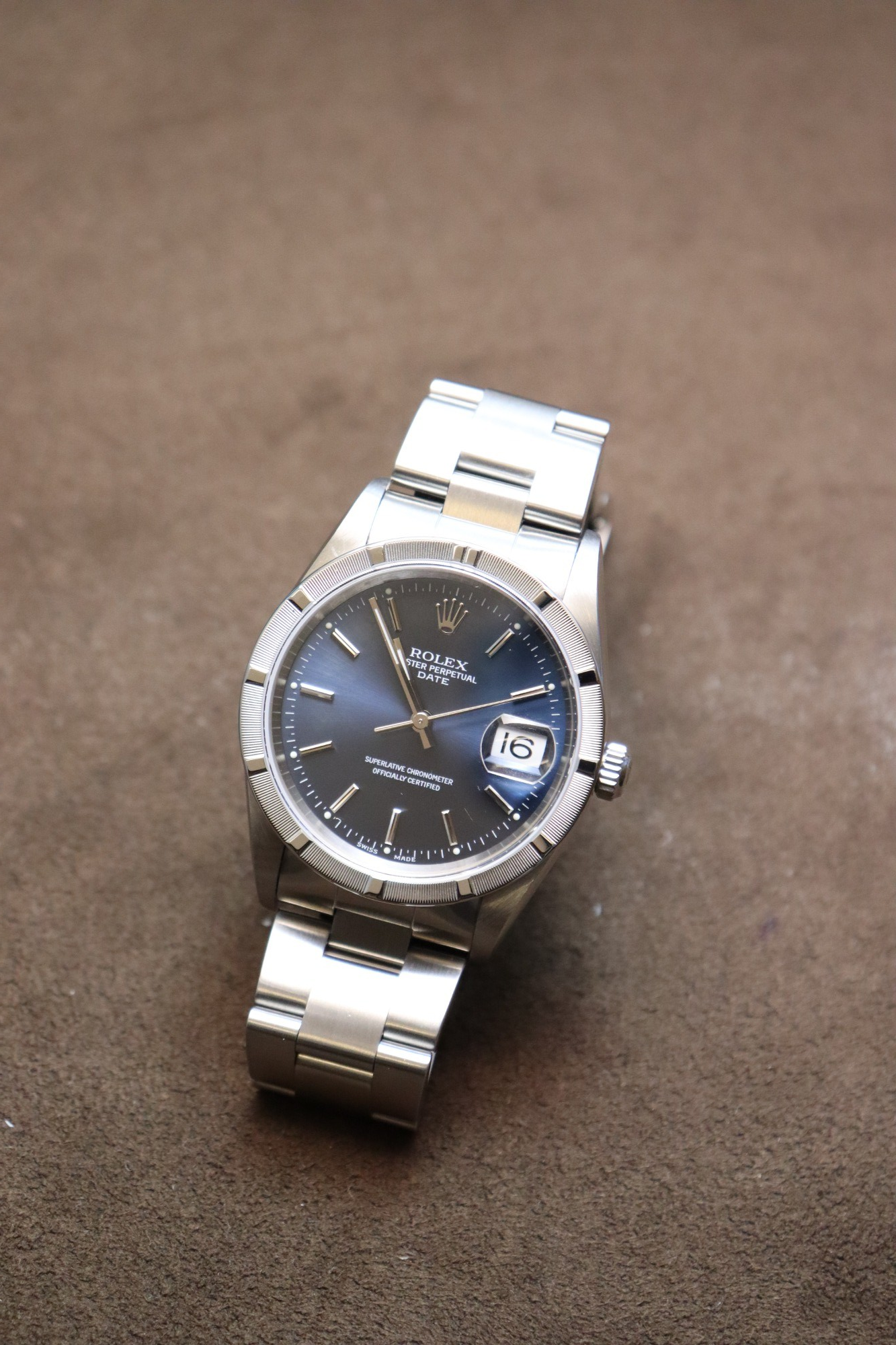 1926年に発表された世界初の防水腕時計である初代「オイスター」の直系にあたる自動巻きモデル「オイスターパーペチュアル」に、デイト表示を追加した「オイスターパーペチュアル デイト」。「Ref.15210」は1990年頃~2007年頃まで製造された、エンジンターンドベゼルを備えた34mm径のステンレススティール製のモデルです。バーインデックスを備えたブルーダイヤル仕様。Cal.3135搭載、約48時間パワーリザーブ。当店オーバーホール済み。