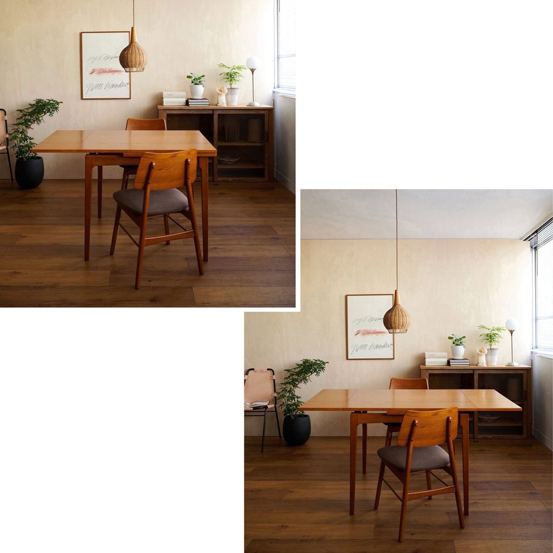 天板下に収納された伸長板をスライドさせるだけで簡単にサイズを変更できるため、普段はコンパクトに使いながらも、必要なときには広々とした作業スペースや快適な食事空間を確保できます。