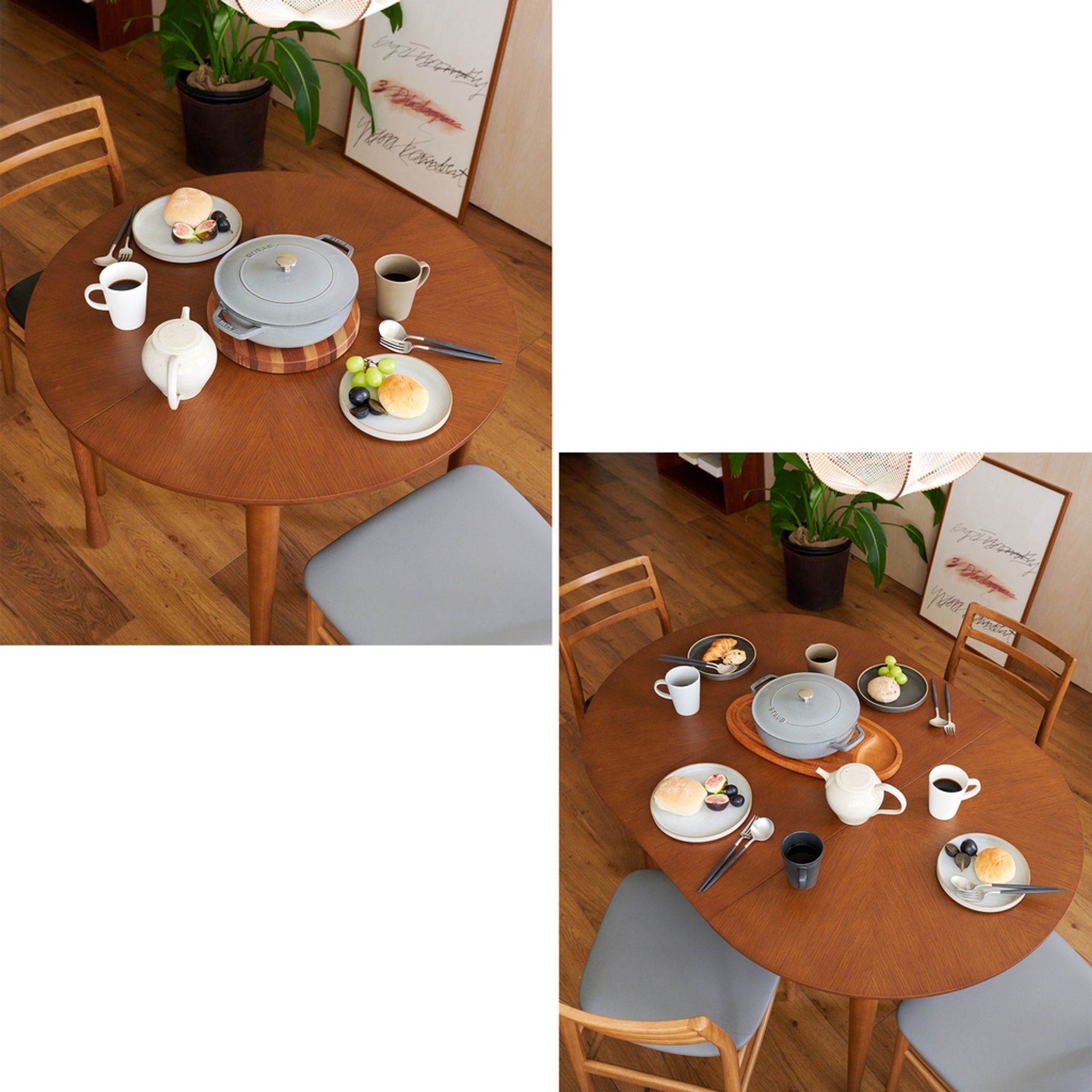 さらに、回転式の天板と広がる脚の仕組みにより、テーブル全体のサイズを調整できるため、普段はコンパクトに使いながらも、来客時には広々としたダイニング空間を確保できます。