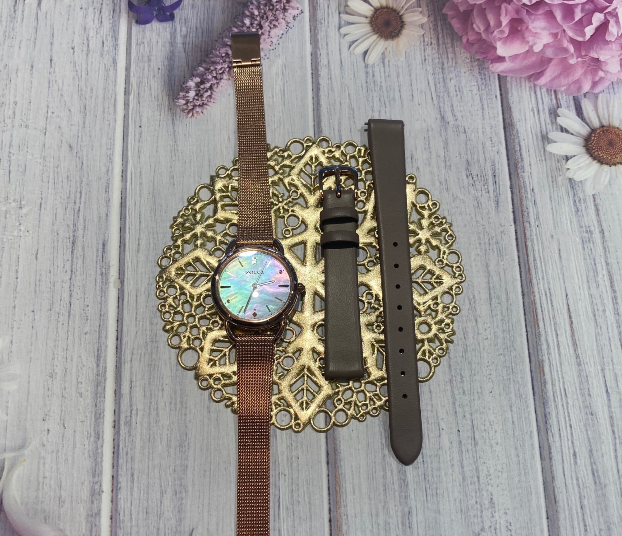 ケースやベルトはピンクゴールドが使われており、デザインはとても女性らしさが伺えるお時計になっています!