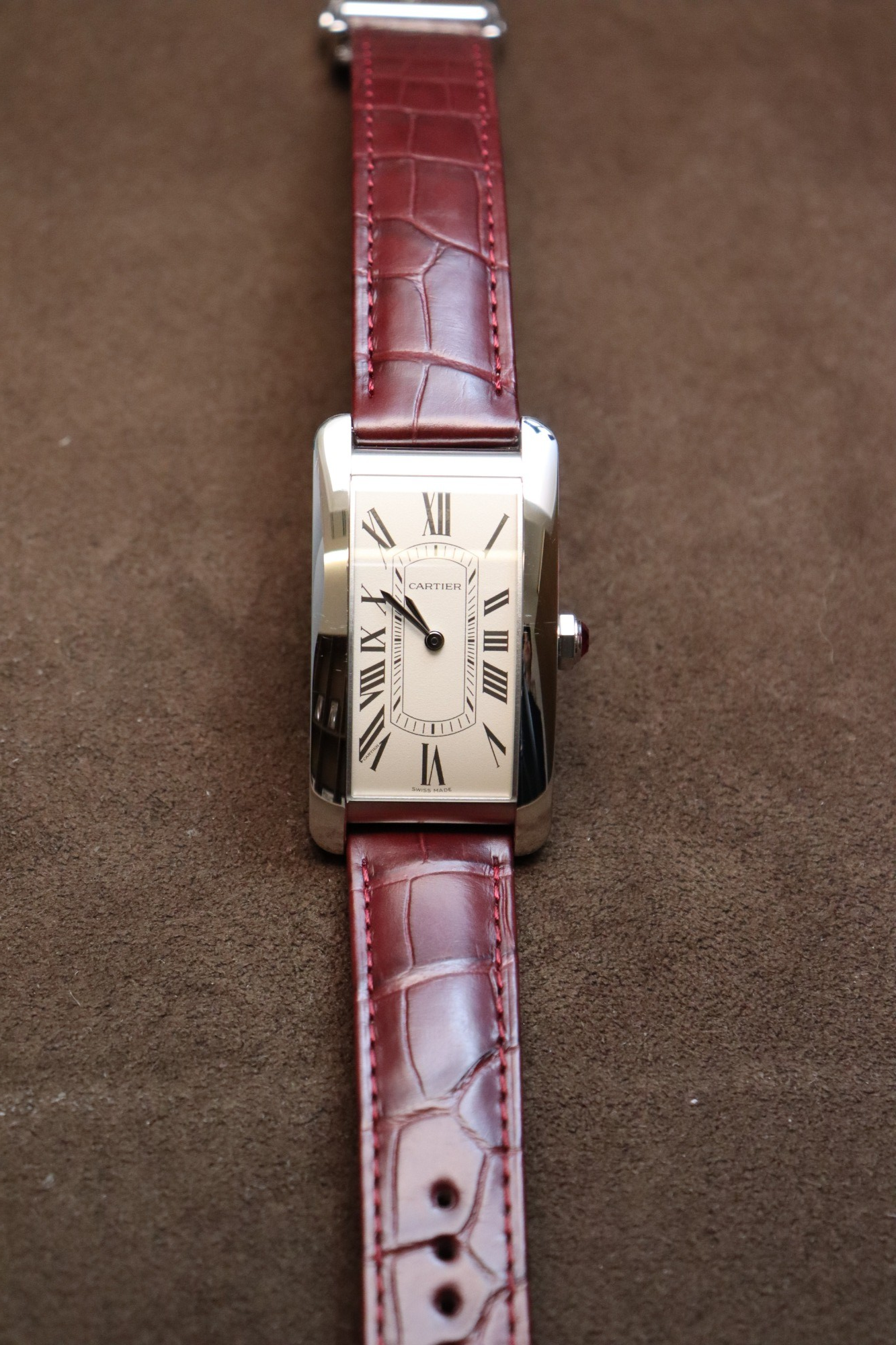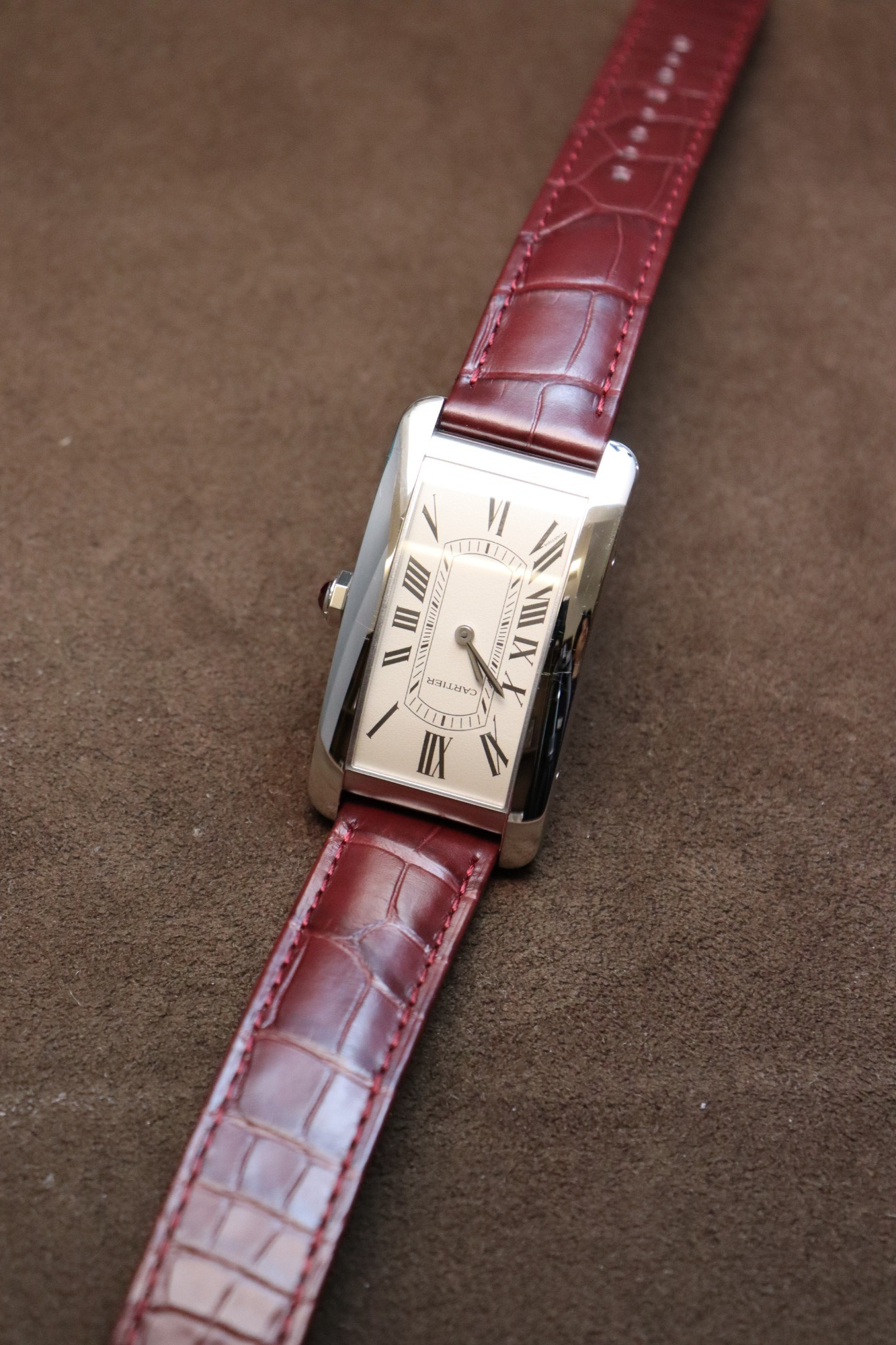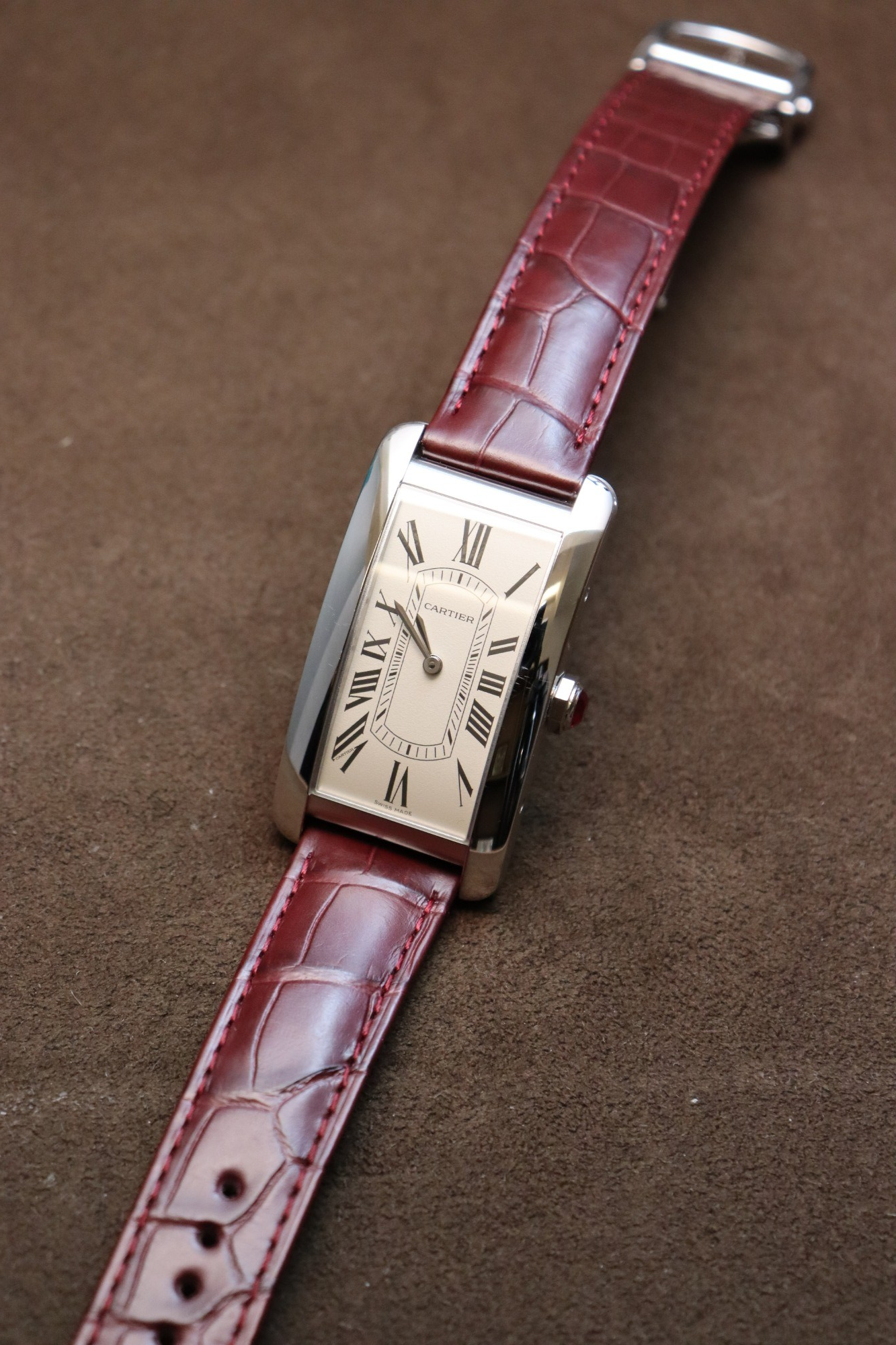 縦方向に長い個性的なデザインとカルティエらしい美しいディテールが特徴の「タンク アメリカン」。シンプルながらも褪せることのないデザインで、高い人気を誇るタイムピースです。「Ref.WGTA0296」は2024年に登場したリファレンスで、44.4×24.4mmのプラチナ製ケース(デプロワイヤントバックルはホワイトゴールド製)に、グレイン仕上げのエッグシェルカラーのダイヤルを採用した流通量の少ないタイムピースになります。