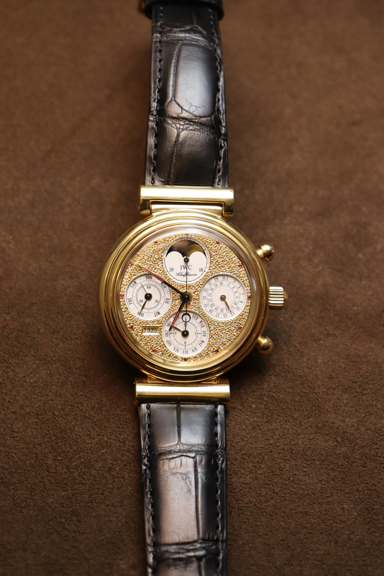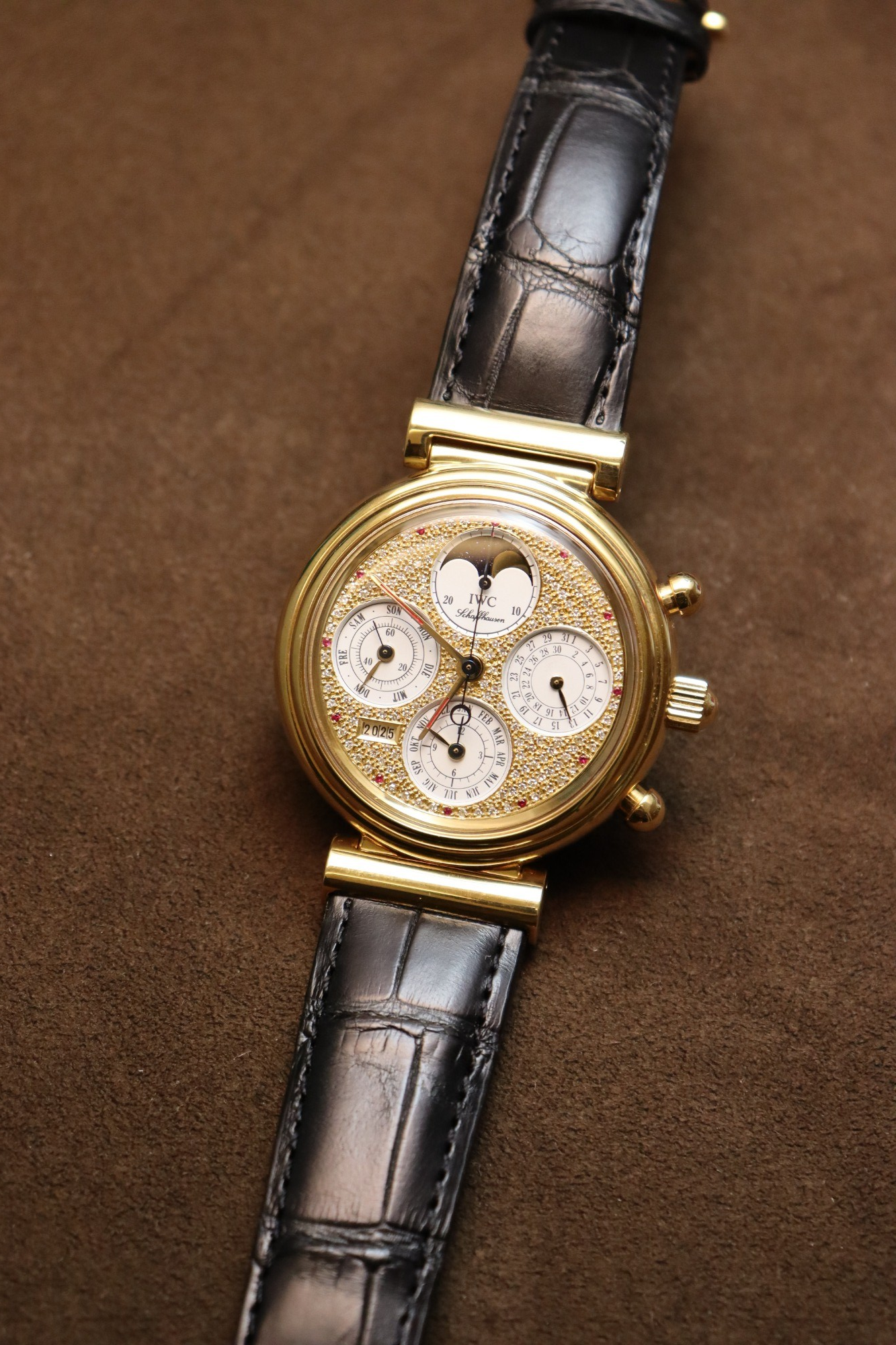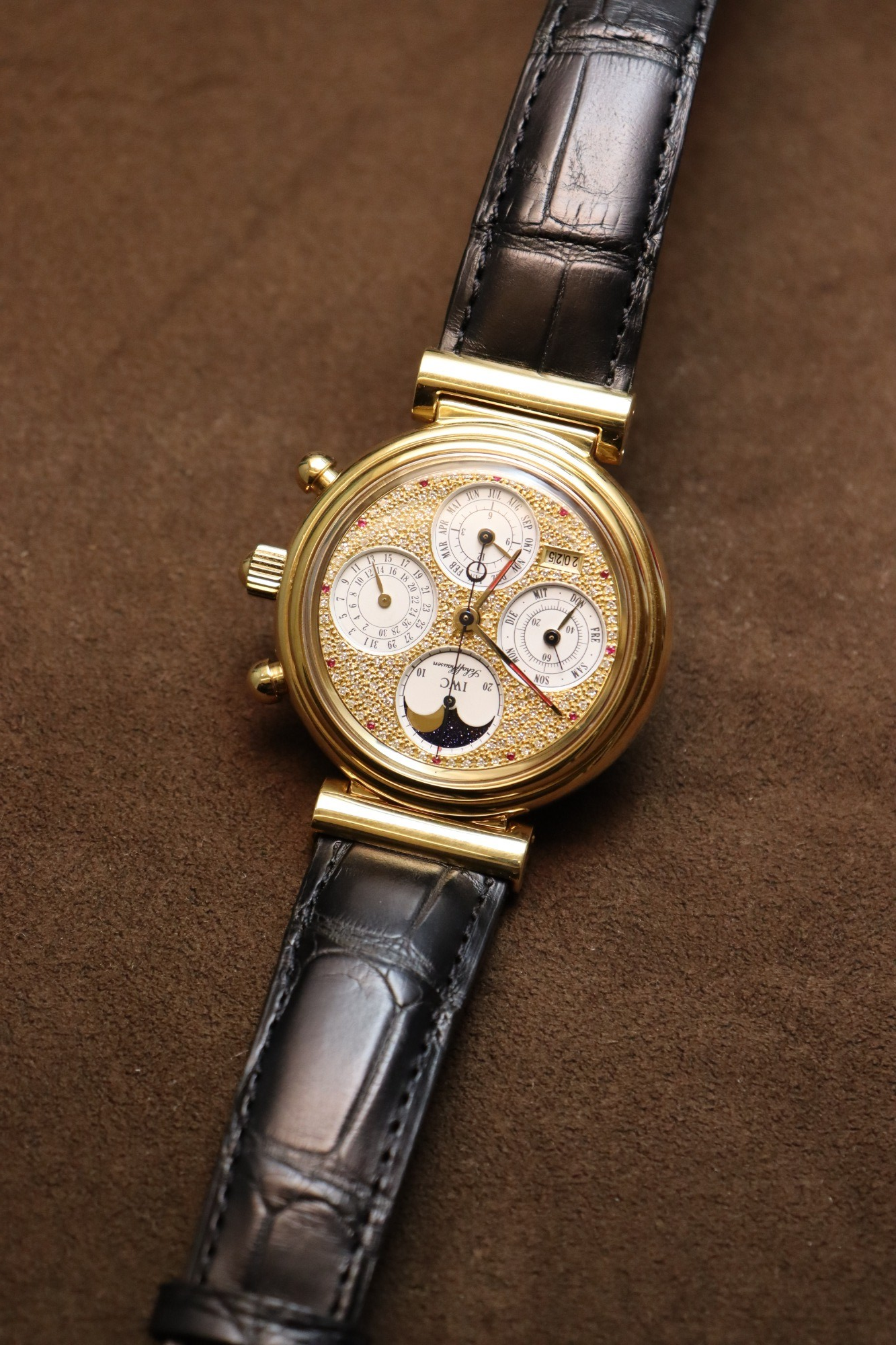 パーペチュアルカレンダー(永久カレンダー)という複雑な機構を備えながら、リューズひとつでカレンダー調整可能(2499年まで表示)。年、月、日、曜日、ムーンフェイズを表示。生産終了したIWCの傑作モデルです。純正ダイヤモンド。2023年6月メーカーオーバーホール済み。