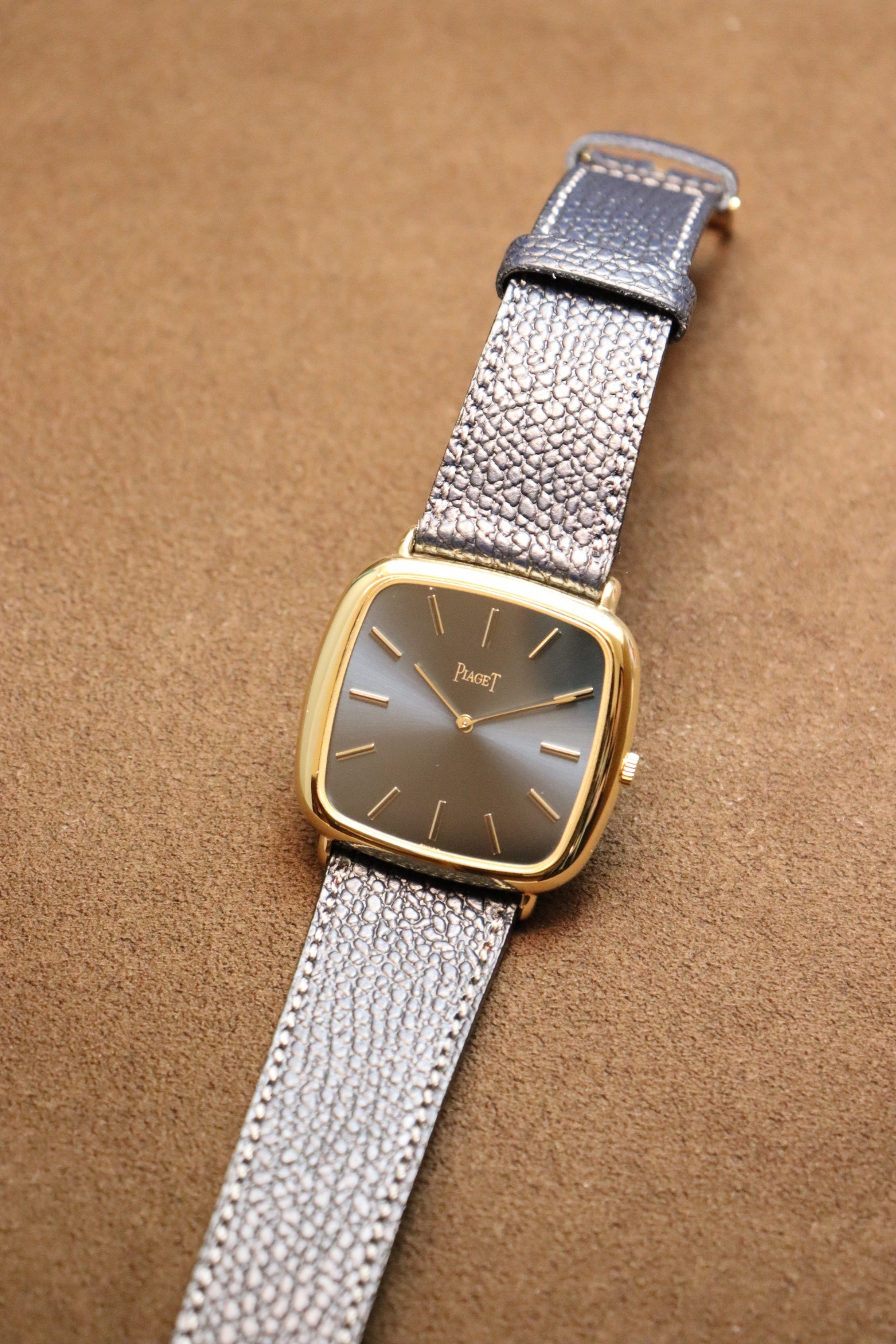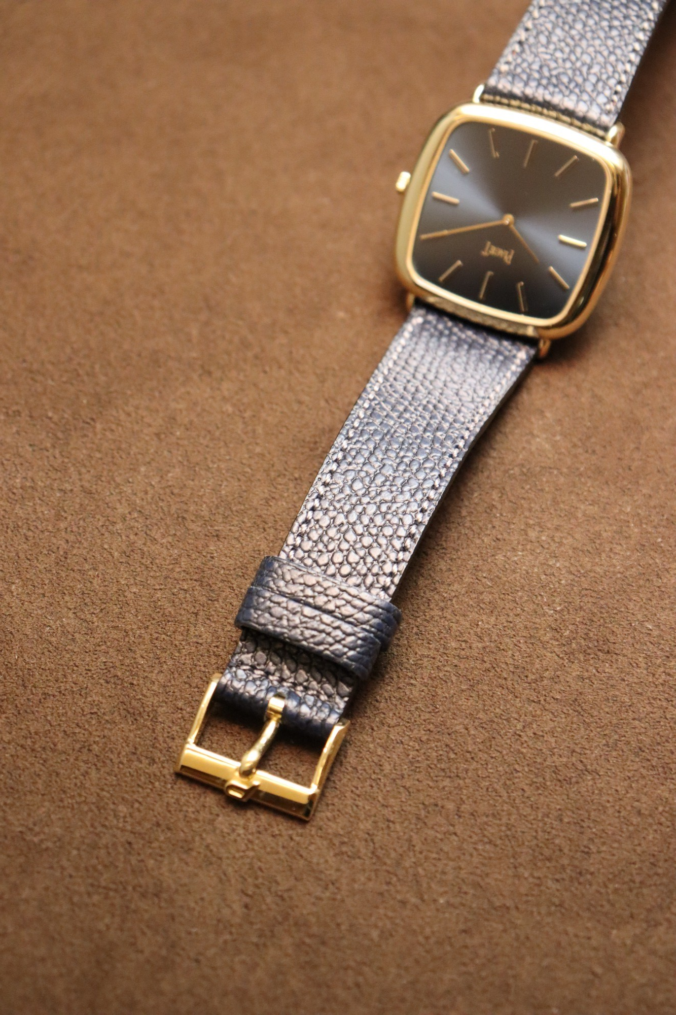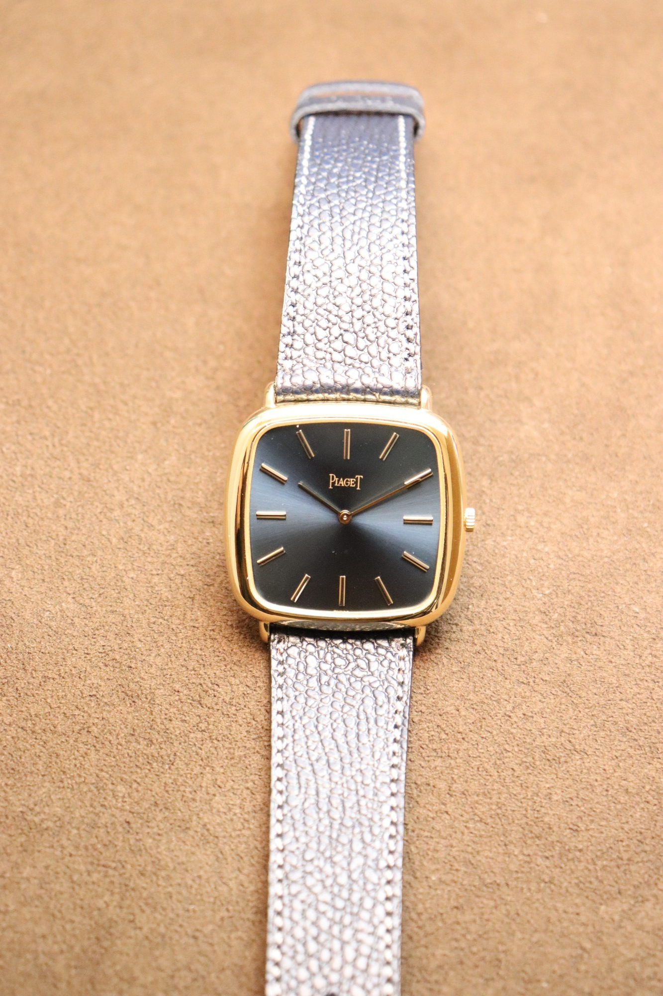 クッション型のスクエアケースが特徴の当モデル。イエローゴールドケースとブルー文字盤のコントラストにより、目を惹く上品な意匠となっております。2025年9月メーカーオーバーホール済み。
