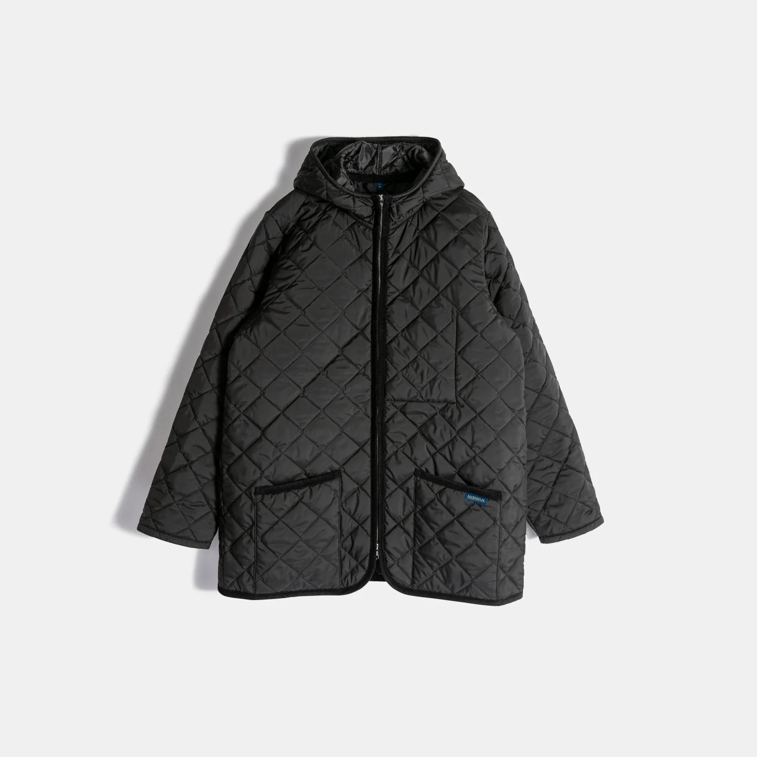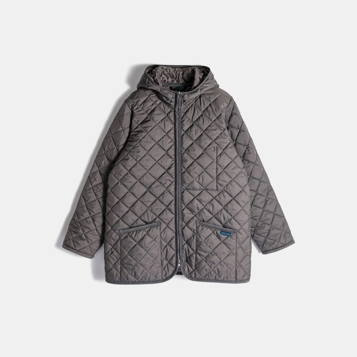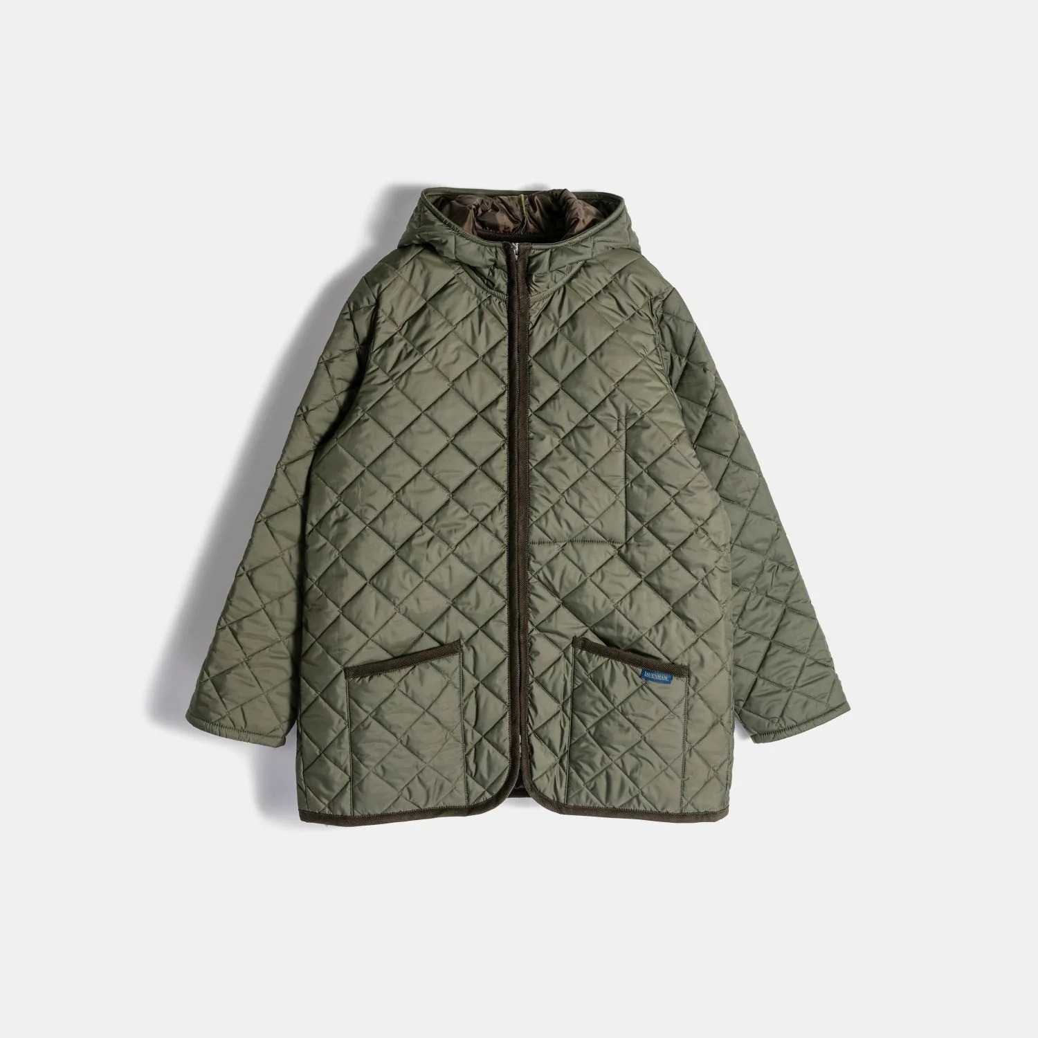 大きなフードが特徴で、リサイクル・ポリエステル100%のラブンスター生地に、2インチダイヤモンドのキルティング加工を施しました。