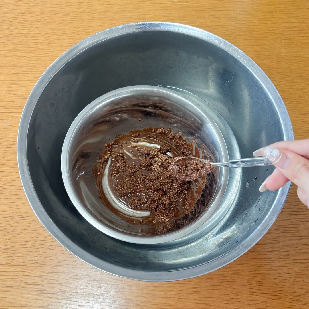 チョコレートが溶けたら、モルトパフの半量を加えて混ぜます。
