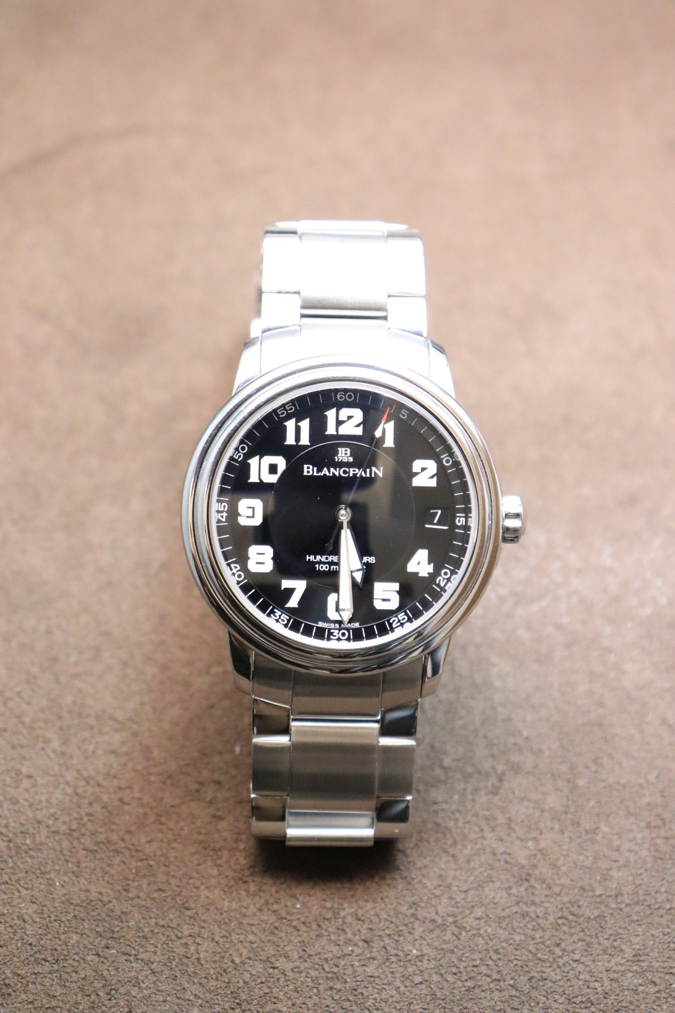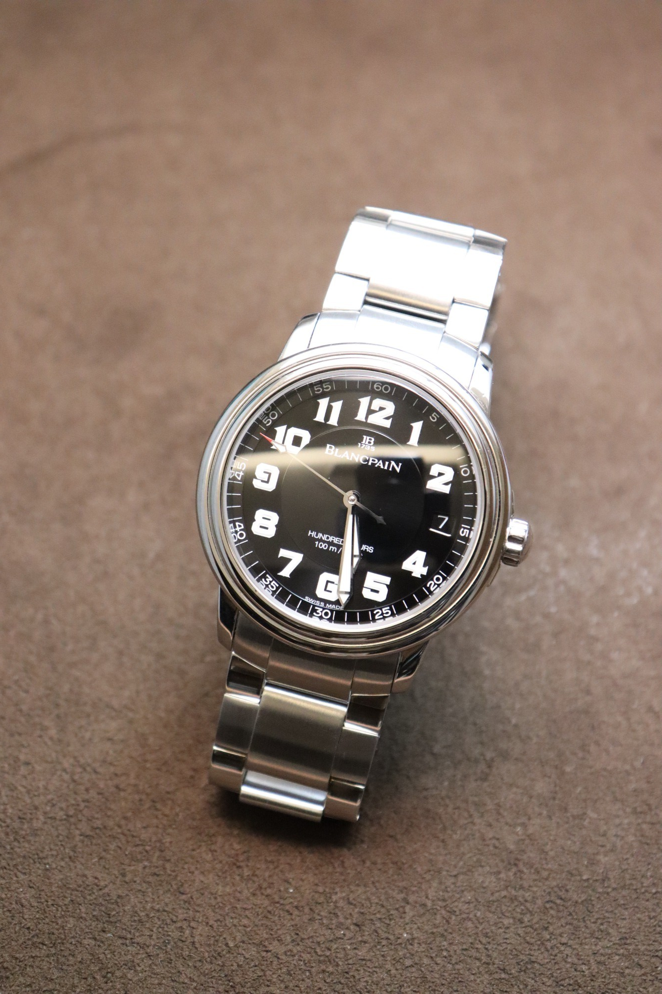 西ヨーロッパ最大の湖「レマン湖」の名を冠したコレクション。上品な雰囲気の文字盤や、ダブルステップ・ベゼルなど、シンプルながらもブランパンの伝統を随所に感じるデザインが特徴のタイムピースです。「Ref.B2100-1130M-71」は38mm径のステンレススティール製ケースに、アラビア数字インデックスを配したミリタリーテイストのブラックダイヤルを組み合わせたリファレンスとなっております。キャリバー「1151」搭載、約100時間パワーリザーブ。当店オーバーホール済み。