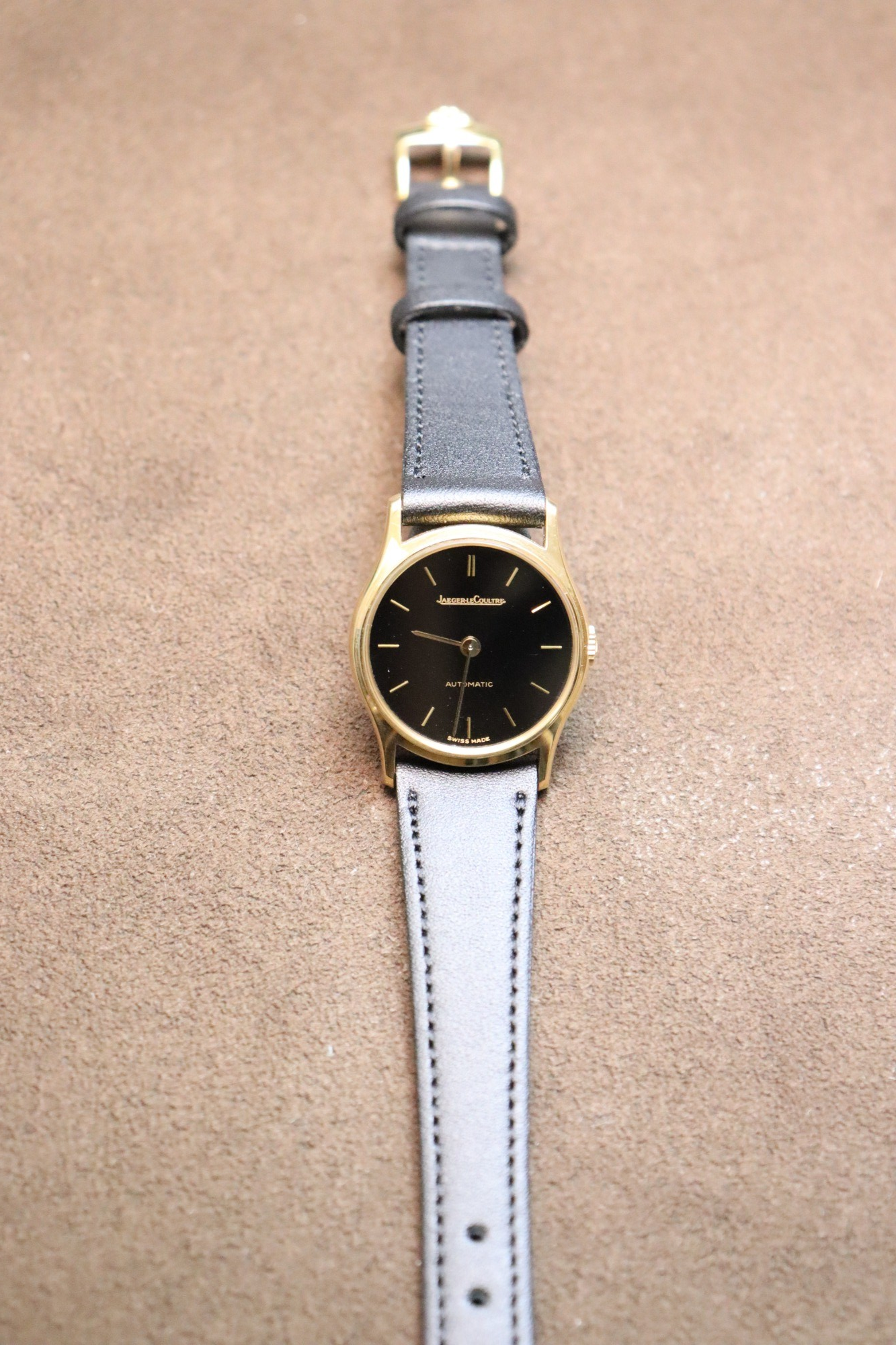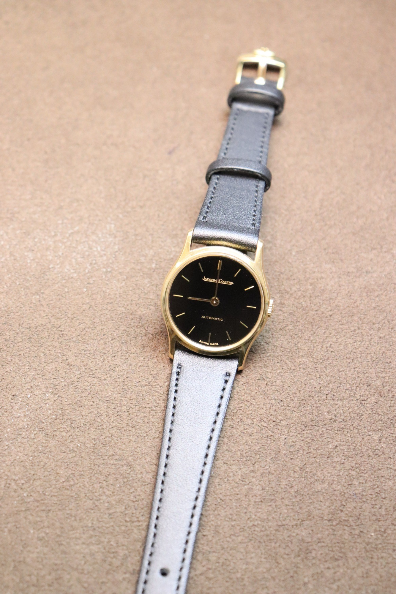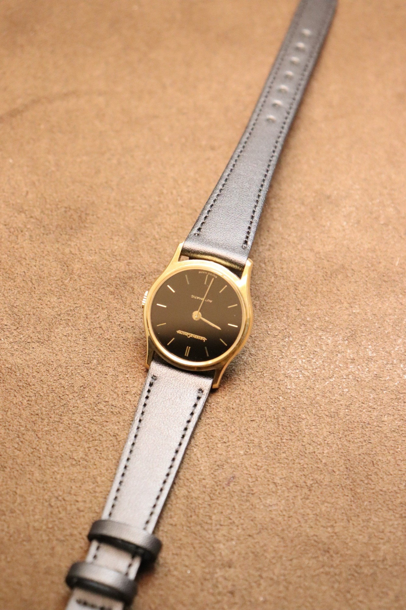 24mmの小ぶりなイエローゴールド製ラウンドケースに、自動巻きムーブメントを搭載した約1970年代頃のレディースウォッチ。バーインデックスを備えたシックなブラックダイヤルを組み合わせた、シンプルかつ上品な雰囲気のタイムピースです。当店オーバーホール済み。