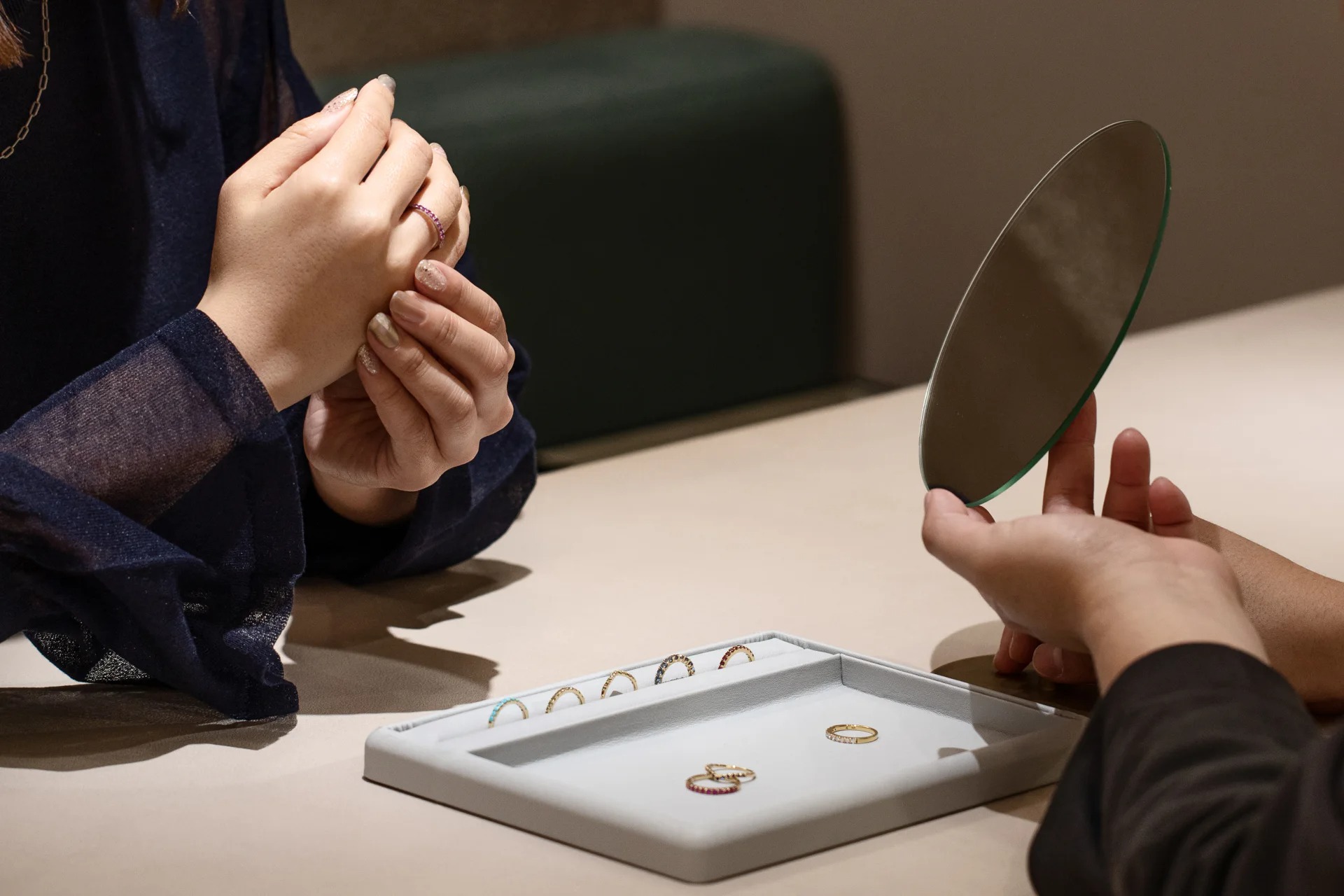 ビズーの実店舗にて、手の形やお好み、お手持ちのジュエリーなどを丁寧にお伺いし、あなたにぴったりの一本をお探しします。