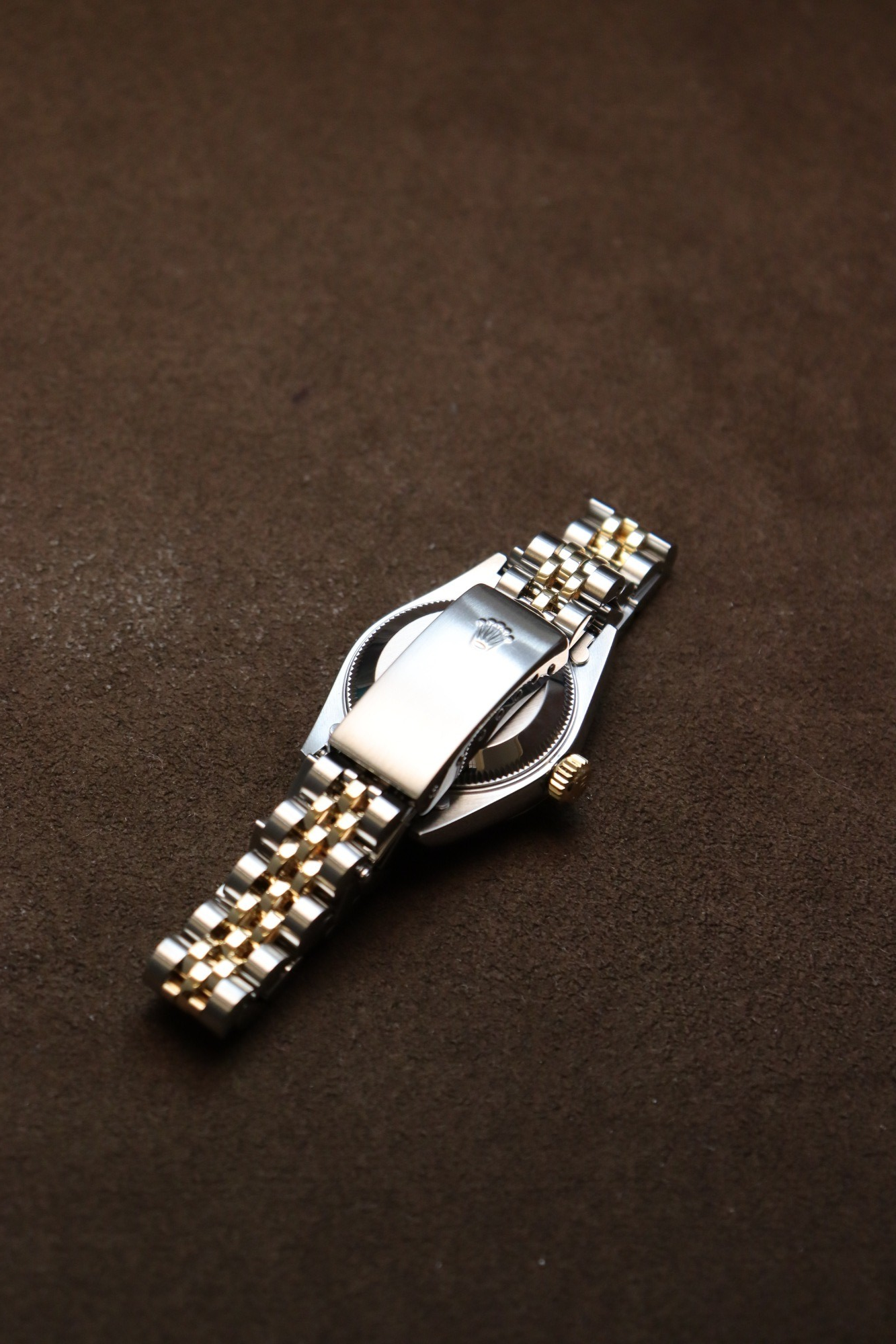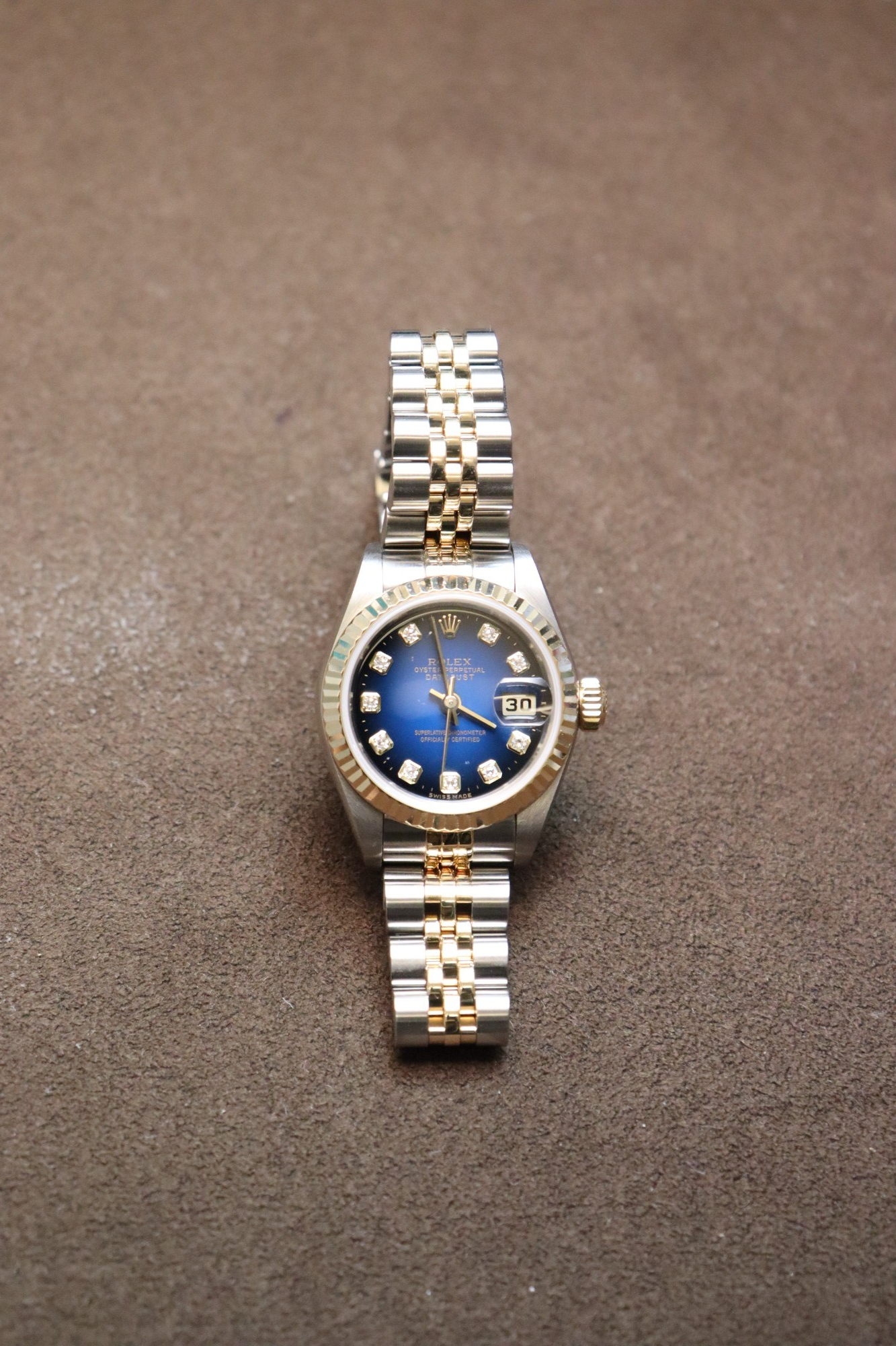 防水性の高いオイスターケース、午前0時に瞬時に日付が切り変わるデイトジャスト機構、全回転式ローターを搭載したパーペチュアル機構といったロレックス三大機構を搭載した定番人気モデル「デイトジャスト」。K18イエローゴールドとステンレスを組み合わせたロレゾールモデル「Ref.79173」は、1999年頃~2003年頃まで製造されたケースサイズ26mmのレディースウォッチです。10ポイントのダイヤモンドインデックスを備えたブルーグラデーションダイヤル仕様。当店オーバーホール済み。