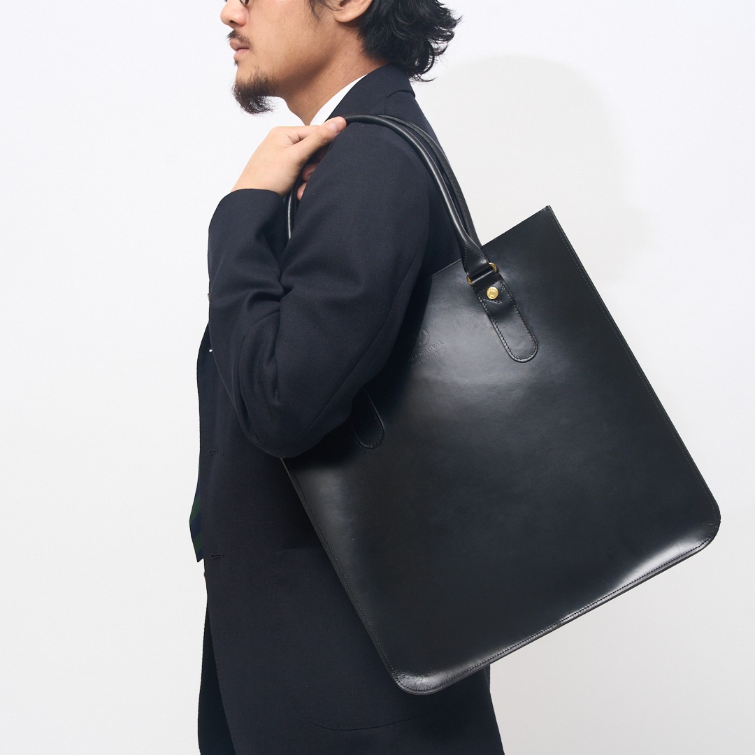一般的にはややカジュアルな印象を受けるトートバッグですが、使い込むほどに味わいを増すブライドルレザーと英国製のアンティークブラスのパーツを採用した重厚な仕上がりは大人のオンスタイルに相応しい品格を感じさせます。A4サイズの書類やノートパソコンが余裕をもって収納できるサイズ感に加え、床に置いたときに本体が自立する仕様で、ビジネスシーンに欠かせない機能性も抜かりありません。