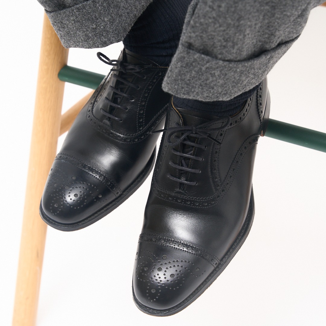 オンのスタイルでも遊び心を忘れたくない。エレガンスと共にほんのりと華やかさが欲しい。そんな洒落者にこそおすすめしたいのがセミブローグシューズ。ブローギング(穴飾り)が施され、クラシカルな品格を感じさせる一足です。ドレス要素が強い内羽根仕様のため、都会的で落ち着いた知的な印象を与え、ビジネスシーンにおいて高頻度で活躍すること間違いなし。