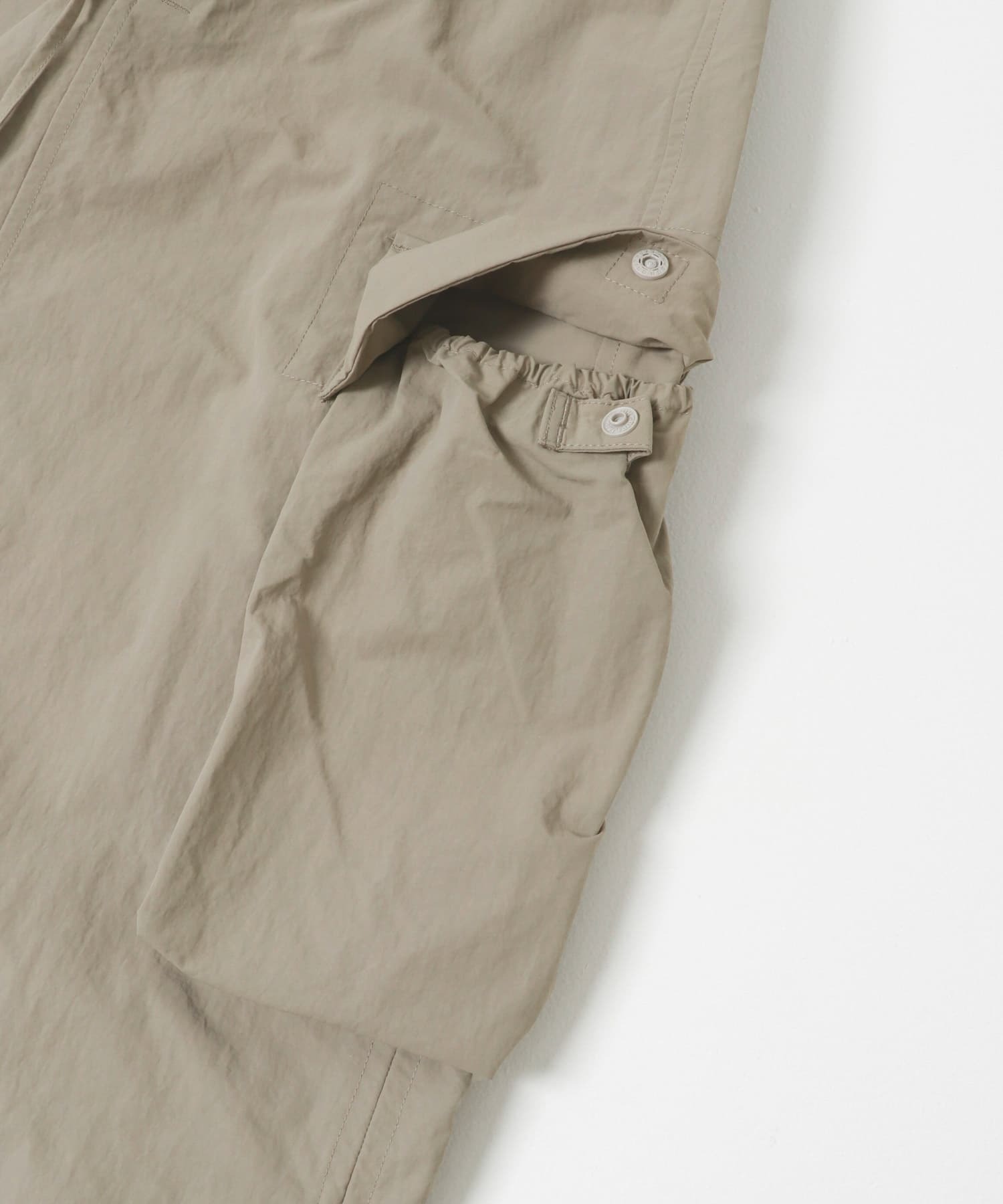 両サイドにはドローコードを配し、ギャザーを寄せることでシルエットの調整が可能。