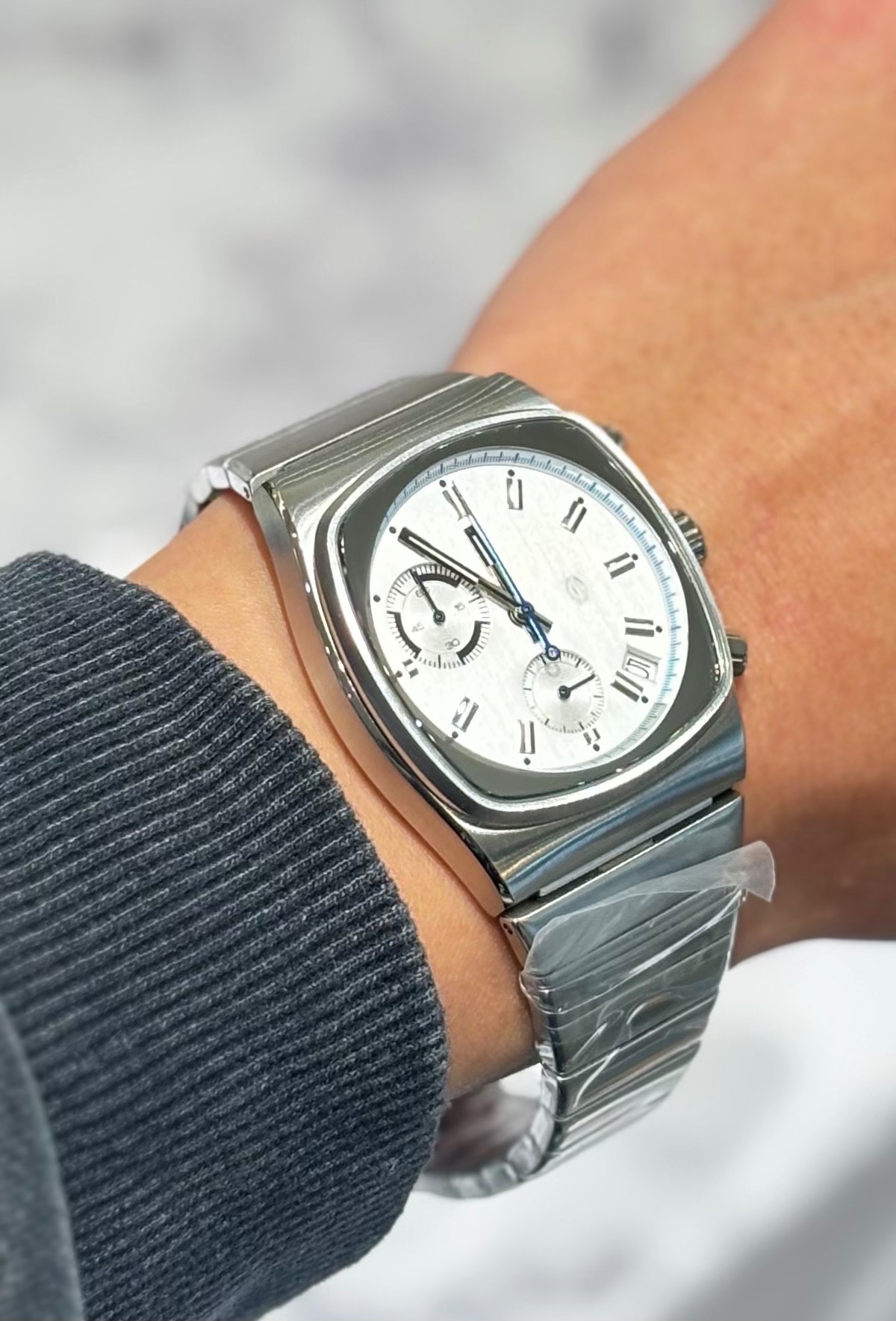 ブルーのアクセントが爽やかも感じさせ、1970年代風トノー型ケースがヴィンテージ感も味わえる一本です♪